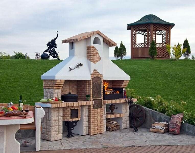 Имееться большая стационарная коптильня для приготовления блюд из мяса, рыбы и овощей на открытом огне и в духовом шкафу