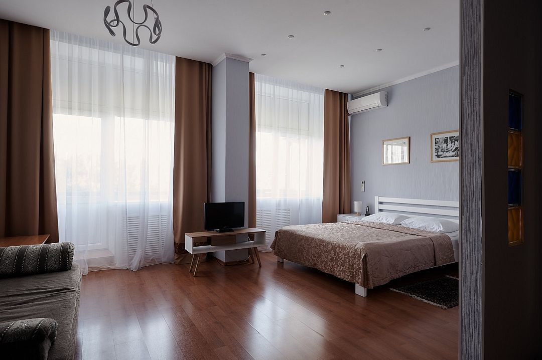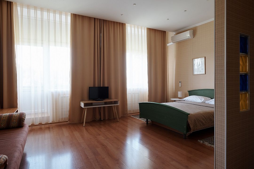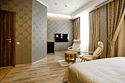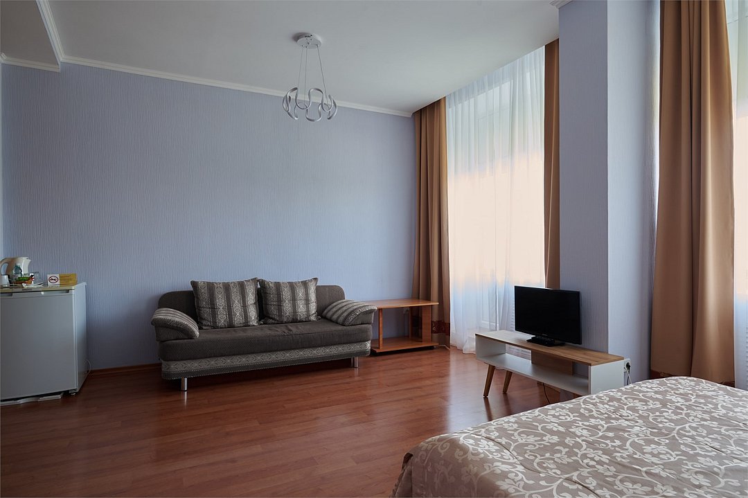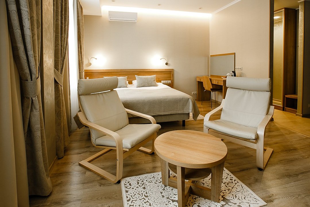 спутниковое телевидение, Wi-Fi, телефон, холодильник, кондиционер, фен, обогреватель, ванная комната, душевая кабина, банные полотенца, тапочки, косметические средства, балкон с красивым видом, кровать «Queen size», гипоаллергенное белье, тумбы, шкаф для одежды, вешалки, журнальный столик, письменный стол, зеркало, чайный набор, чайник, унитаз, раковина, питьевая вода, отопление, ламинат, стаканы, стул, раскладной диван, телевизор с плоским экраном, можно с питомцамиВ гостиничном номере