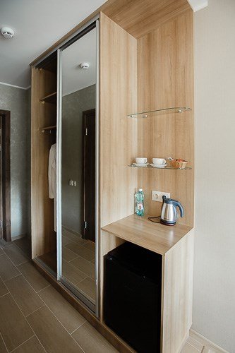 - Электрический чайник, набор чайной посуды, чай, кофе, бутилированная вода