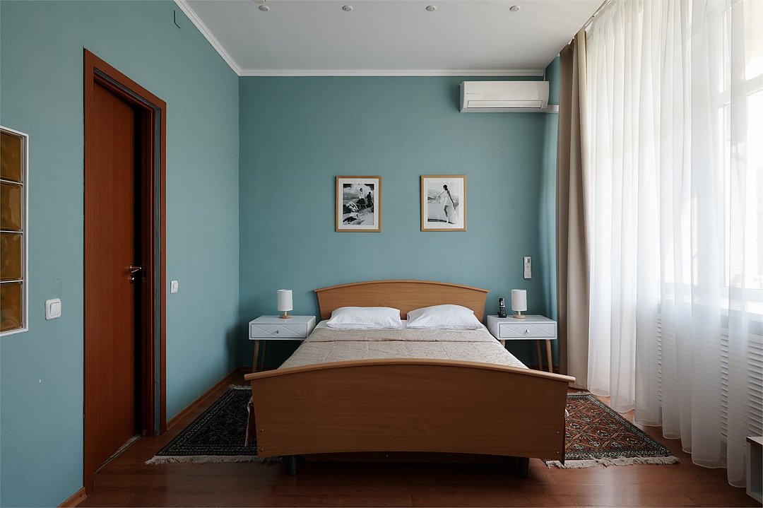 Просторный номер площадью около 20 кв.м. Дизайн в спокойных пастельных тонах. Балкон. Вид на сосновый лес.