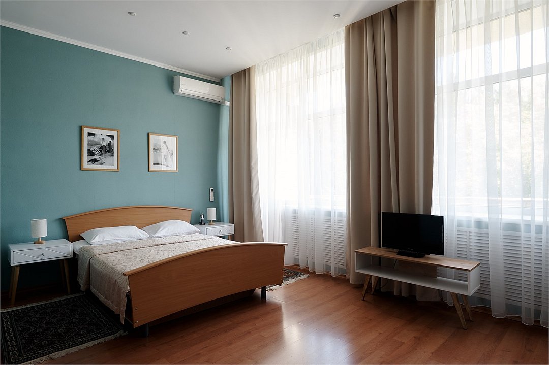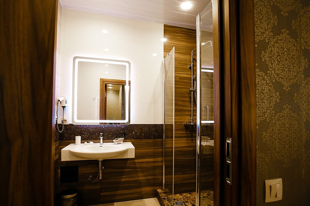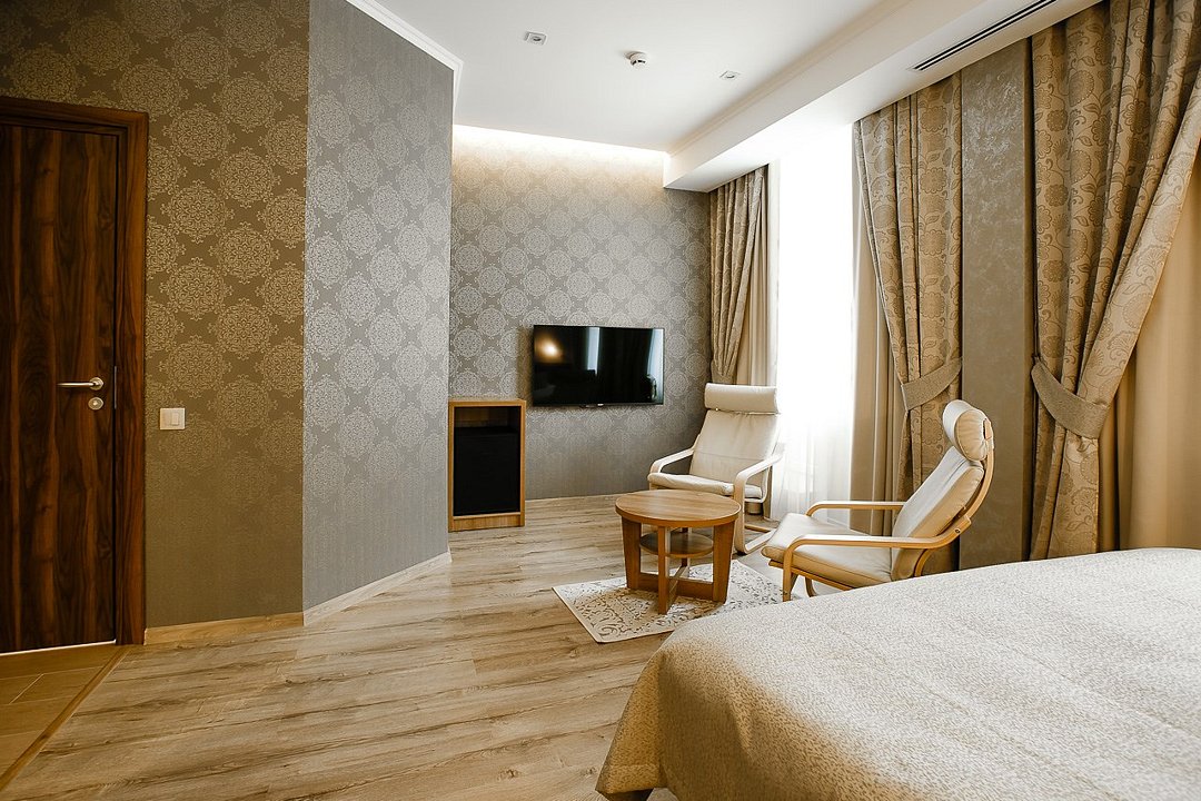 Уютный и просторный номер с элегантным дизайном, балконом и видом на сосновый лес. Просторная и современная ванная комната с элитной сантехникой и тропическим душем позволит насладиться водными процедурами. Большая кровать с приятным белоснежным бельем и ортопедическим матрасом, а также шторы-блэкаут благоприятствуют хорошему отдыху. Подходит для проживания одного гостя или пары, а также семьи с ребенком до 5 лет.Услуги и удобства