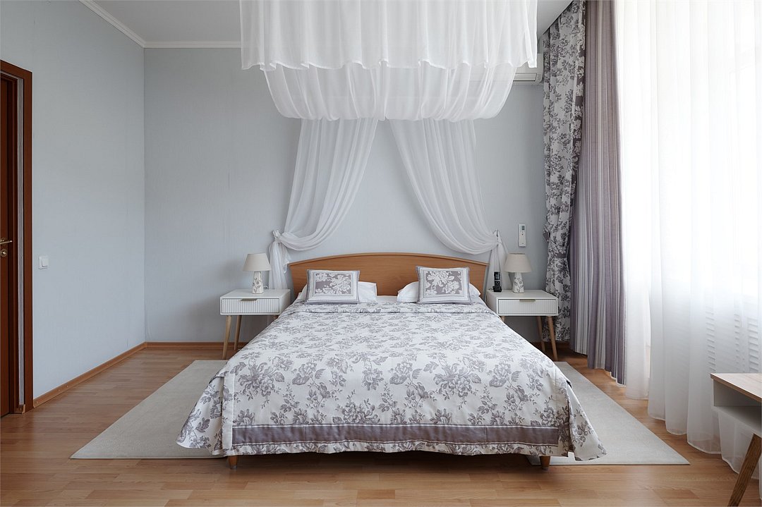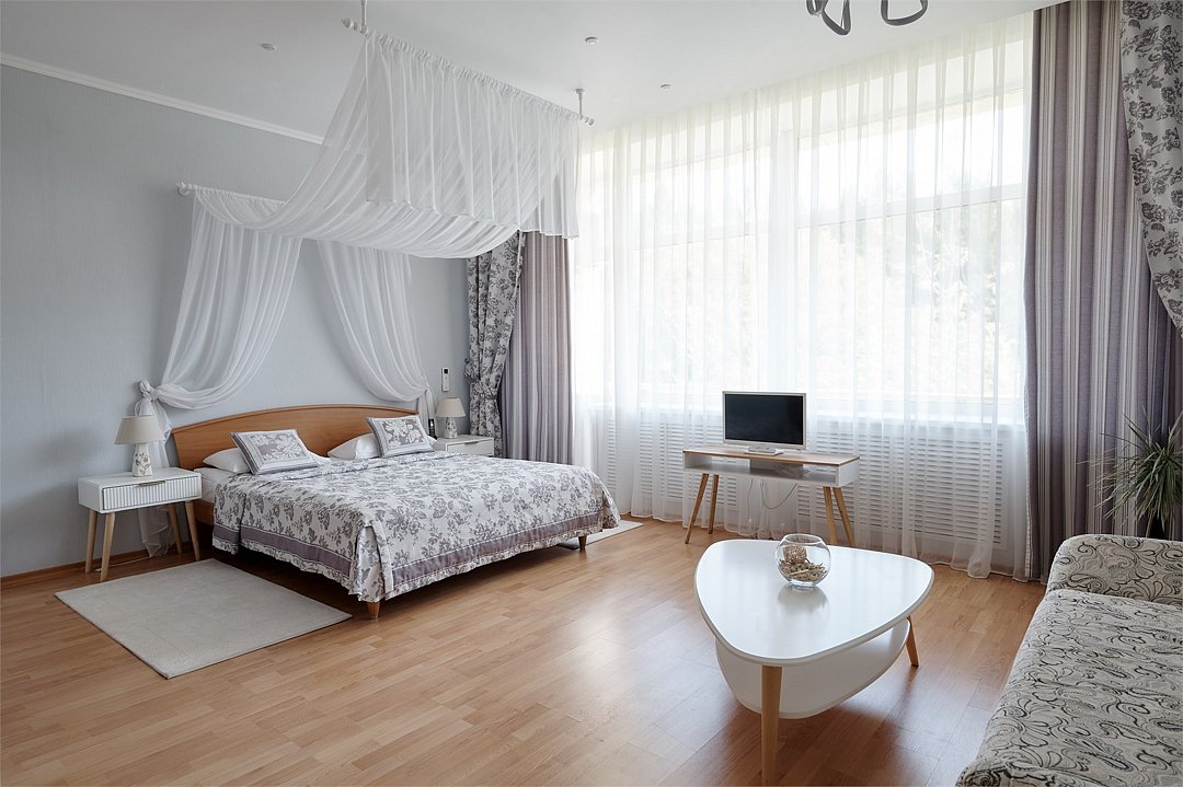 Просторный светлый номер с балконом и видом на сосновый лес. Оформлен в романтичном стиле с балдахином. Номер подходит для размещения одного гостя либо пары, а также семьи с 2 детьми.Услуги и удобства