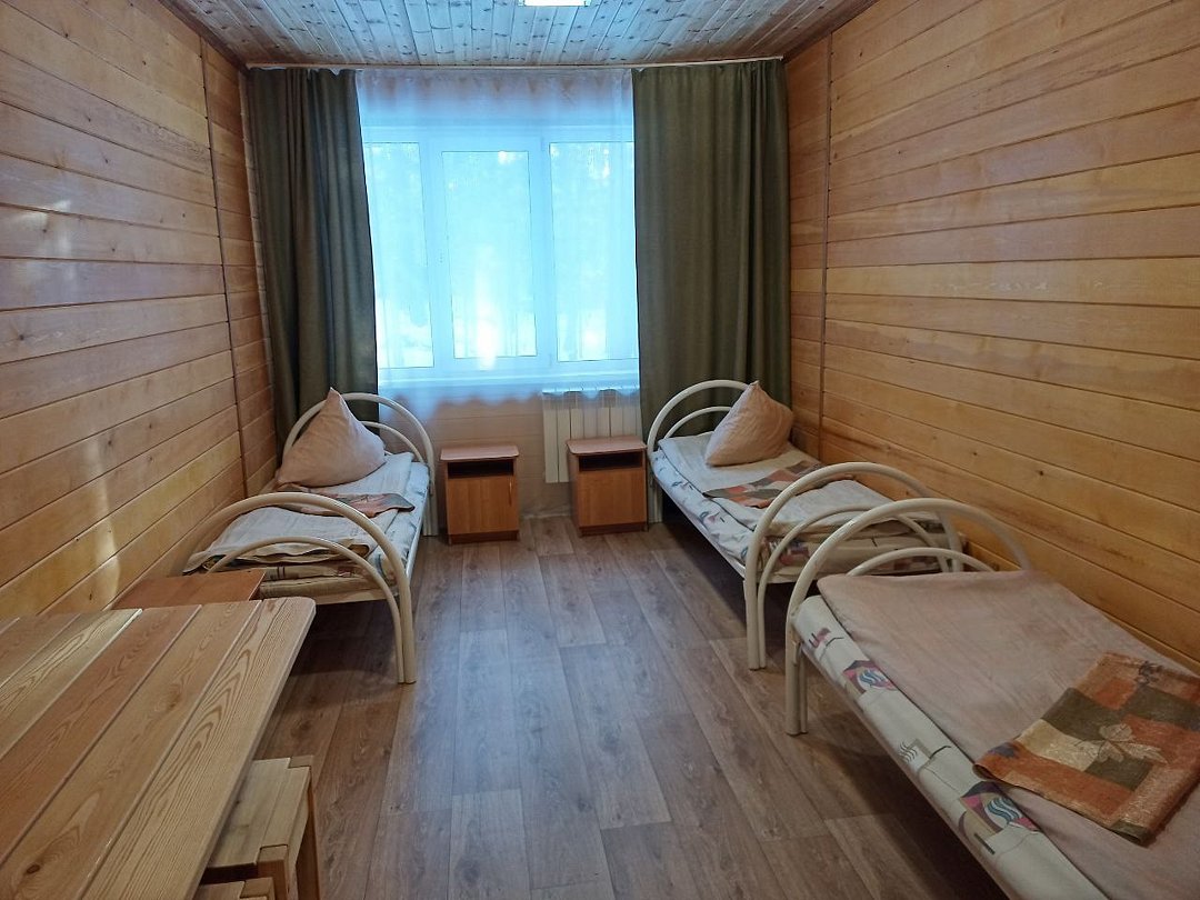 телевизор, Wi-Fi, холодильник, микроволновая печь, вешалки, зеркало, комод, чайник, три односпальные кровати, вид во двор, стул, стол, санузел на этаже, душ на этаже, вид на лесВ гостиничном номере