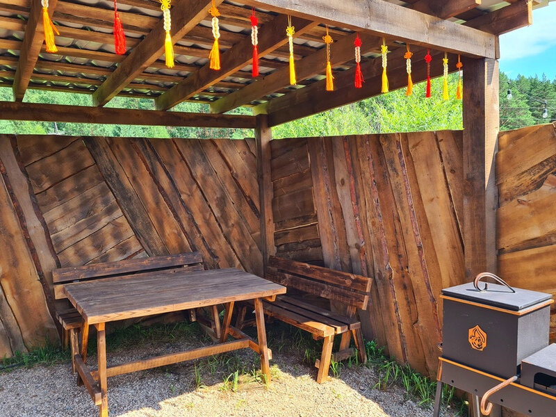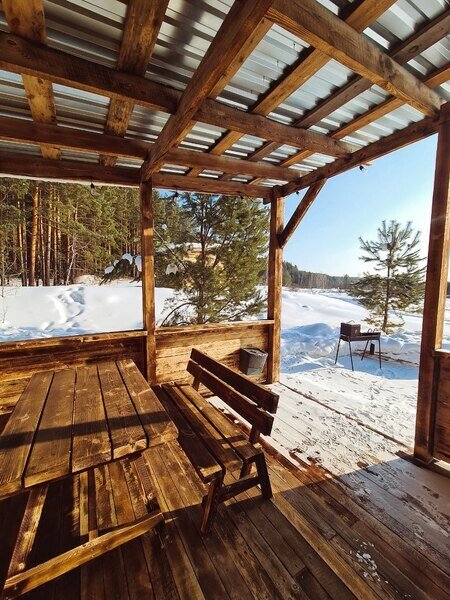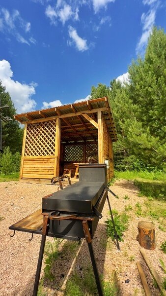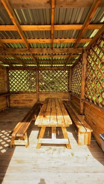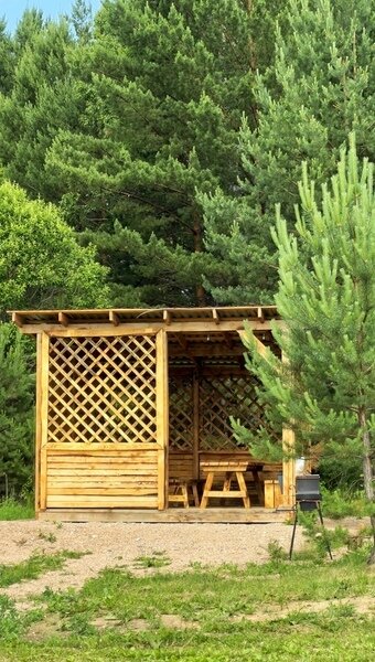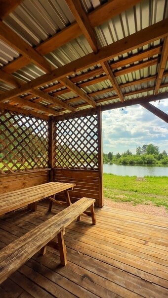 Открытая беседка на 10-12 человек. Есть электричество и освещение. Стоимость — 250–350 ₽/час. В стоимость входит использование мангала–барбекю с шампурами.