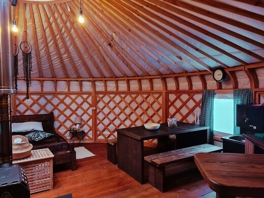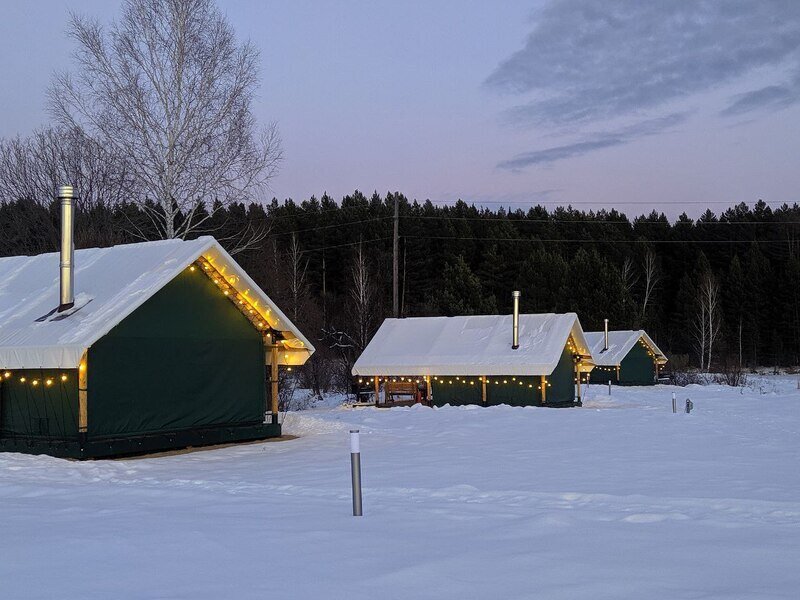 Первый в Красноярском крае глэмпинг «Берег Кана» находится в живописном месте, на берегу реки Кан в городе Зеленогорске, также на территории находится три Ильинских пруда, пять просторных юрт европейского типа и пять просторных сафари тентов с дизайнерским интерьером.
