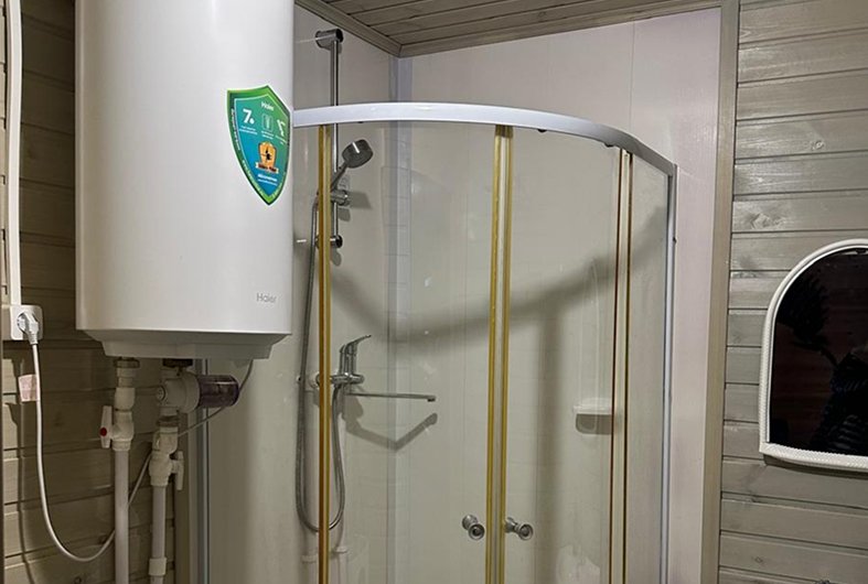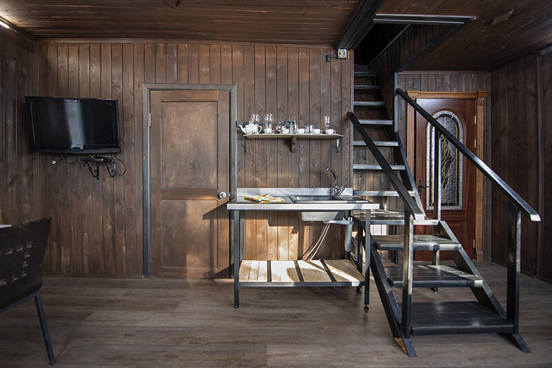На первом этаже общая кухня, один двухместных диван, санузел с душевой и раковиной.