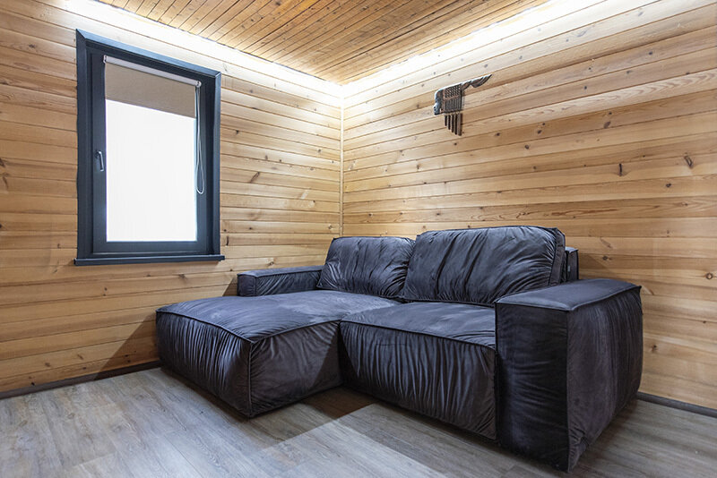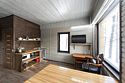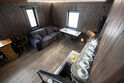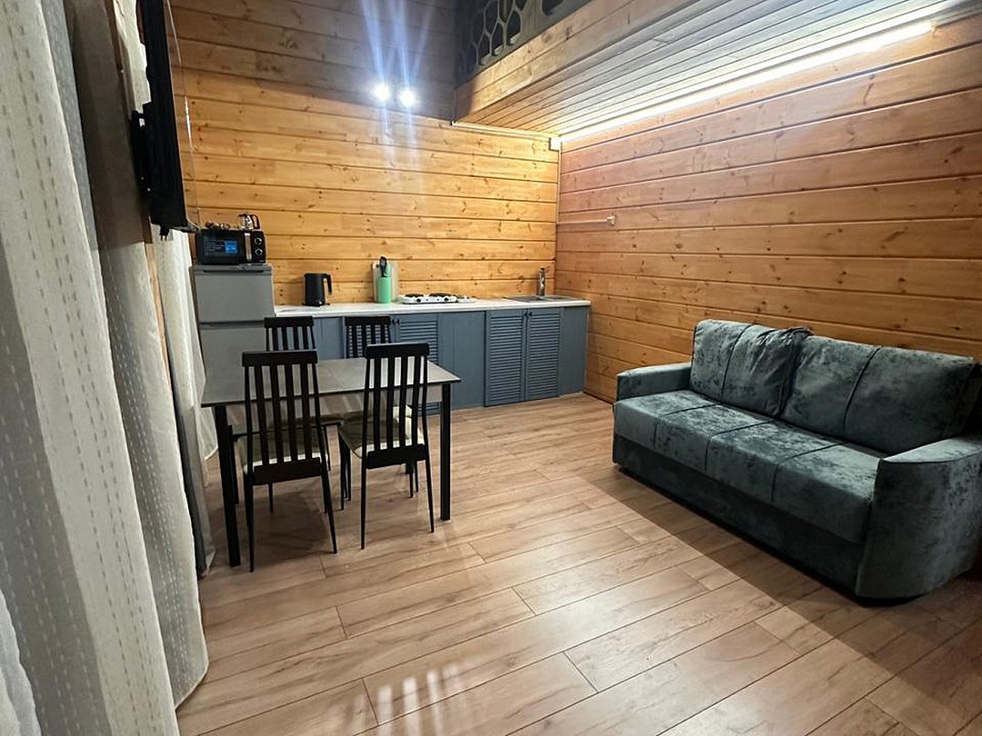 На первом этаже большой диван, изолированная спальня и общая кухня, санузел с душевой и раковиной.