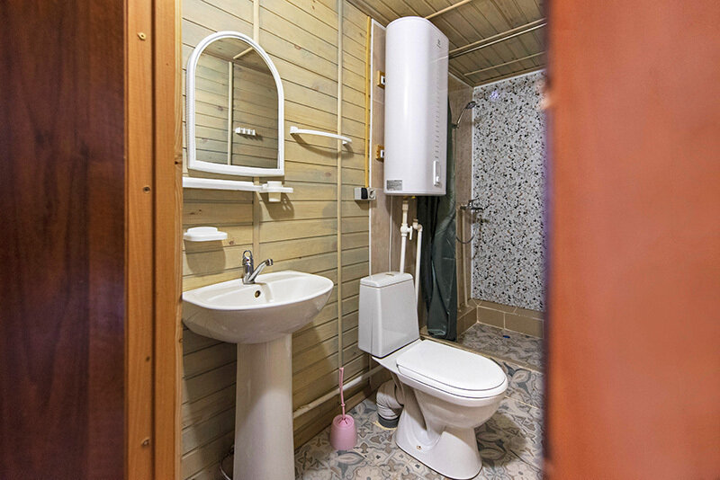 На первом этаже отдельная спальня с 2-местной кроватью, общая кухня, 2-местный диван, санузел с душевой и раковиной.