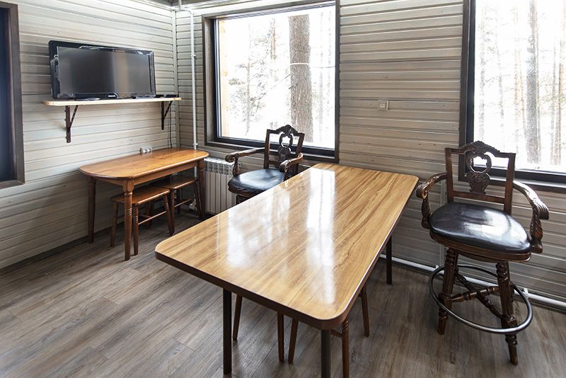 Домики для проживания расположены среди деревьев, поэтому в них не жарко и не холодно, а очень комфортно. В каждом домике есть удобные кровати, чистое постельное белье, полотенца, посуда, холодильники, электрочайники и другие приятные мелочи, наличие которых создает ощущение домашнего уюта. В домиках повышенной комфортности имеется спутниковое телевидение и теплые полы, в летнее время есть возможность пользоваться душевыми кабинами и санузлом. Здесь все создано для того, чтобы Вы, даже посетив базу на сутки-другие, чувствовали себя комфортно.