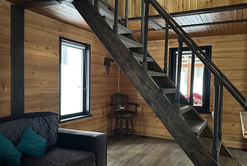 На первом этаже большой диван, изолированная спальня и общая кухня, санузел с душевой и раковиной.