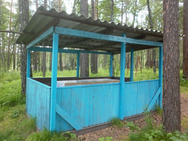 Перед каждым домом имеется мангальная площадка: большой стол с зонтом и мангал.