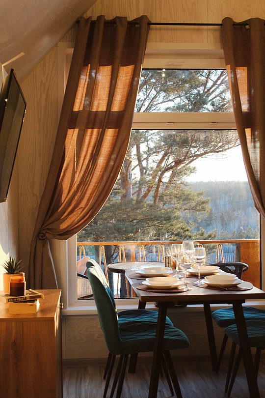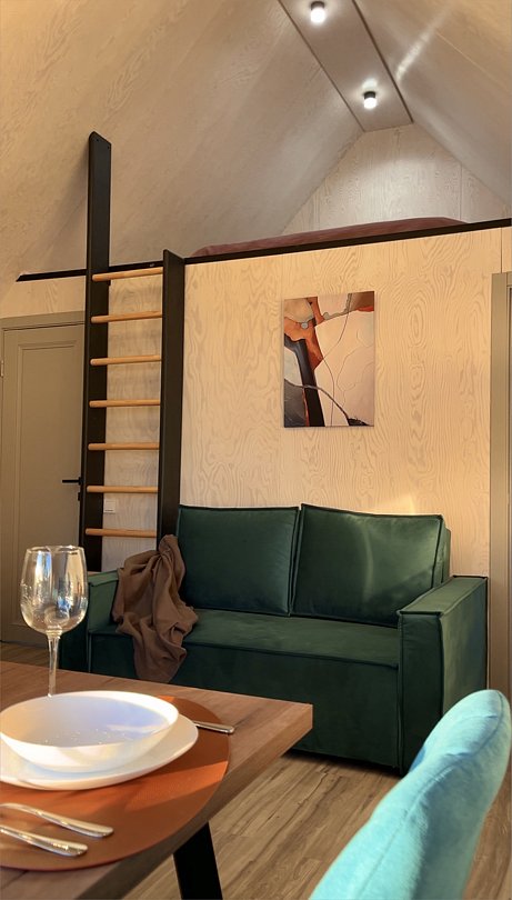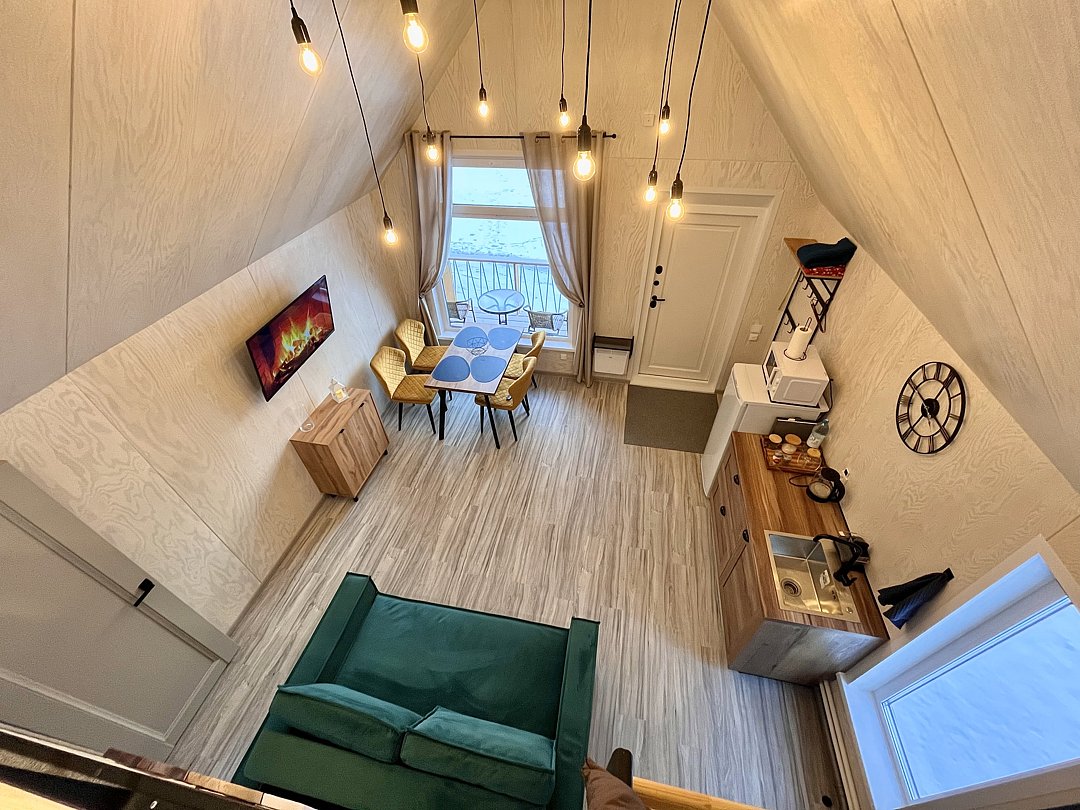 Обеденная зона с захватывающим видом приглашает гостей на завтраки, обеды и ужины, которые можно приготовить на мини-кухне, оснащенной микроволновой печью, холодильником и мультиваркой. На антресольном этаже находится двуспальное место, а отдельная спальня с двуспальной кроватью предлагает отдых после насыщенного дня.