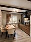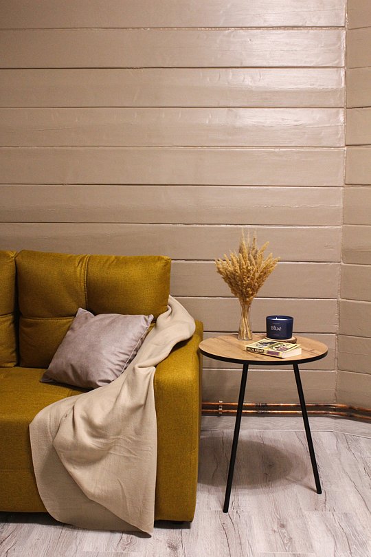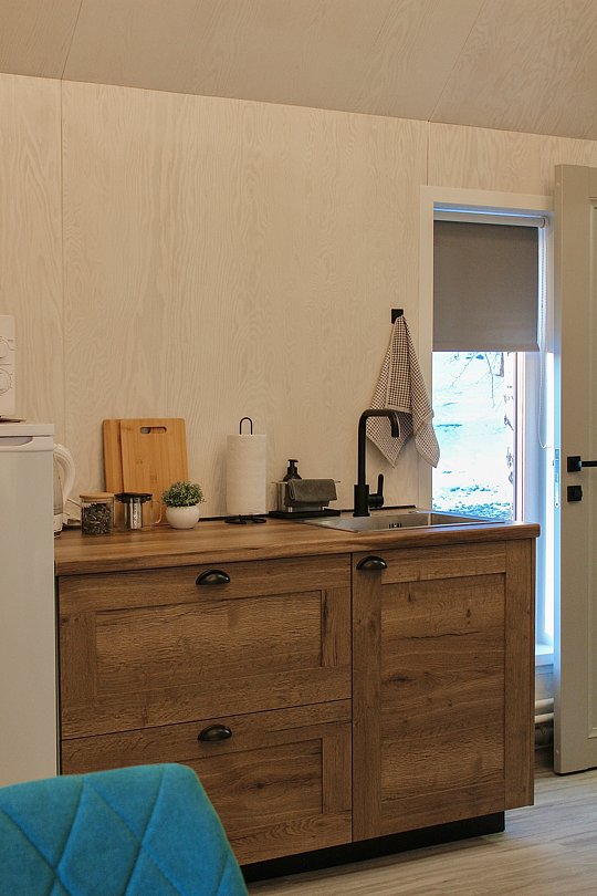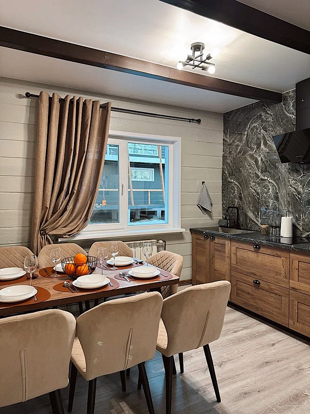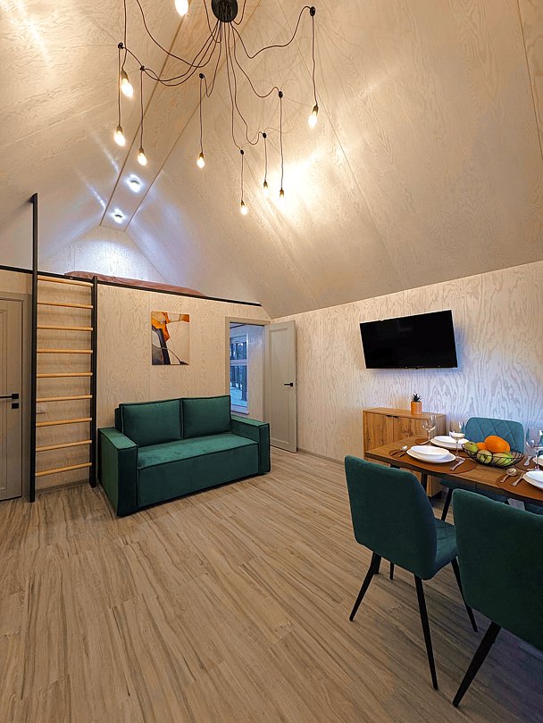 Уютный дом DACHA MINI площадью 40 м² рассчитан на 2–6 гостей и идеален для отдыха вдали от городской суеты. На входе расположена светлая и комфортная гостиная с мягким диваном и смарт-ТВ, где можно наслаждаться любимыми фильмами на «Кинопоиске» и Okko.