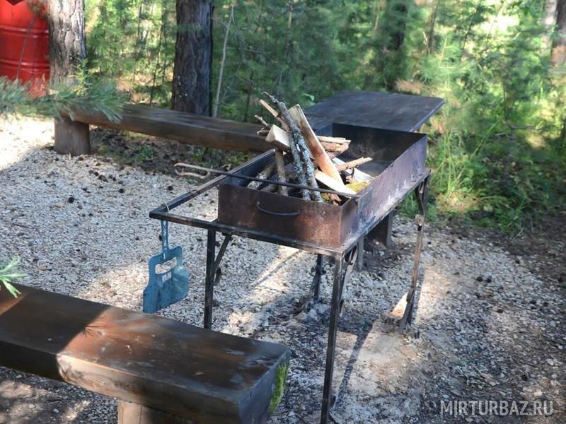 Зона барбекю около каждой беседки – большой мангал, лавочки, умывальник, мусорные урны, ёмкость с водой.