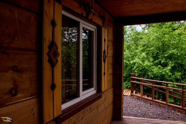 Двухэтажный дом выполнен из кедра, имеет балкон с видом на озеро.