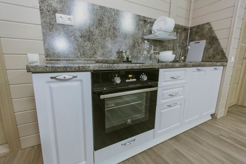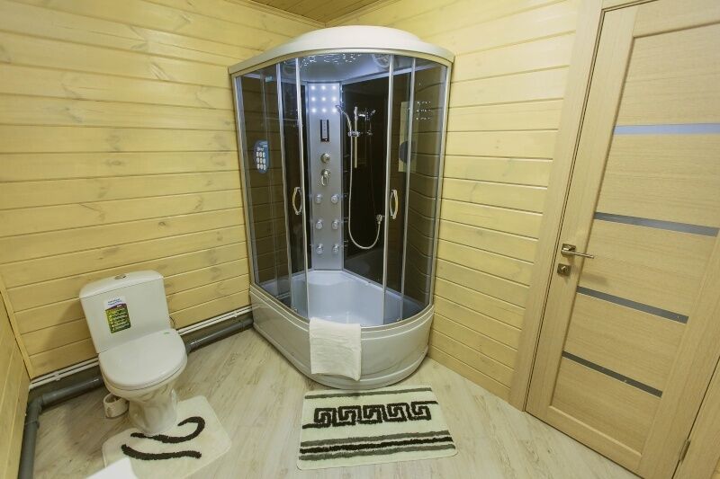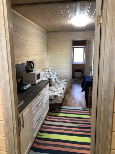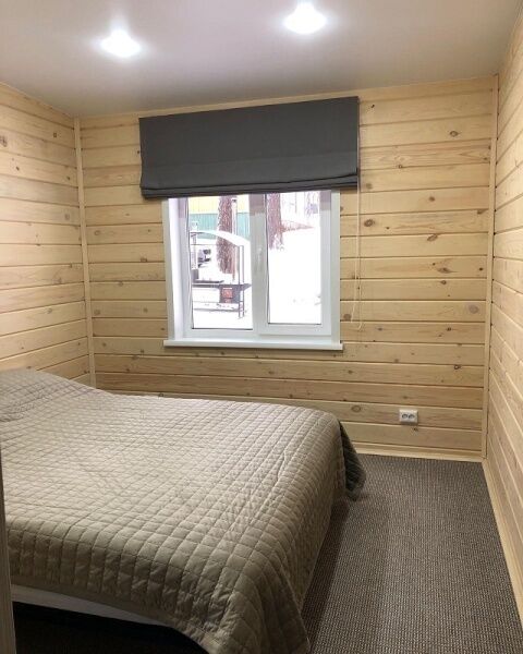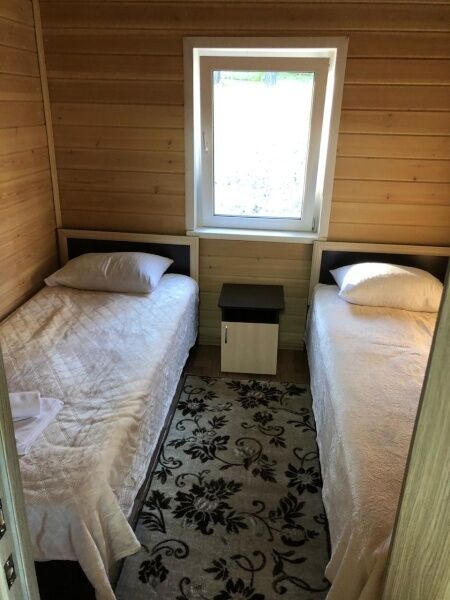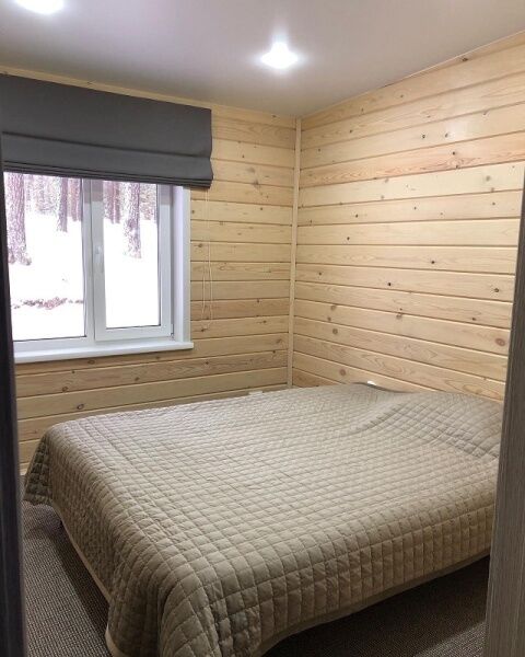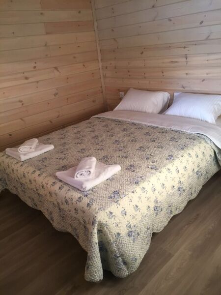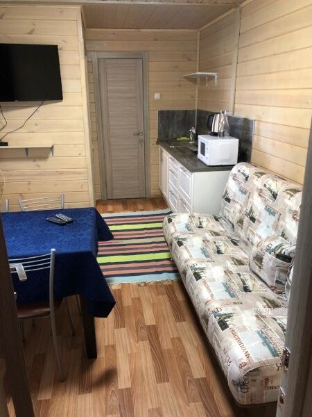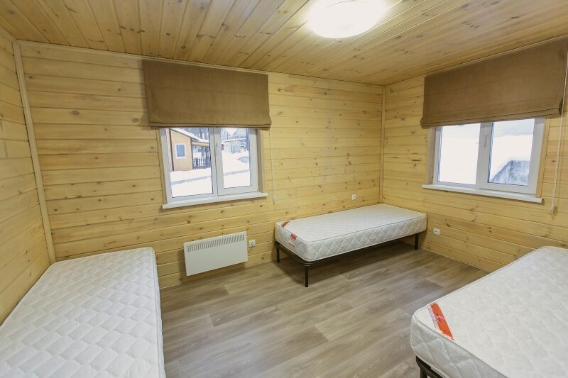 В каждом коттедже 7 полноценных спальных места. В первой комнате 3 одноместные кровати, во второй ‒ одна двуспальная кровать. В гостиной, совмещенной с кухней, большой диван, на котором можно расположиться двум взрослым и одному ребенку. Большой телевизор со спутниковым телевидением, поможет скрасить вечер за просмотром семейного фильма или комедии.