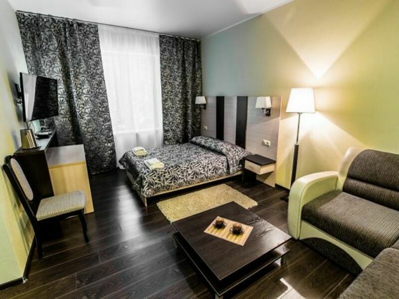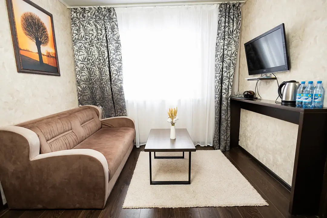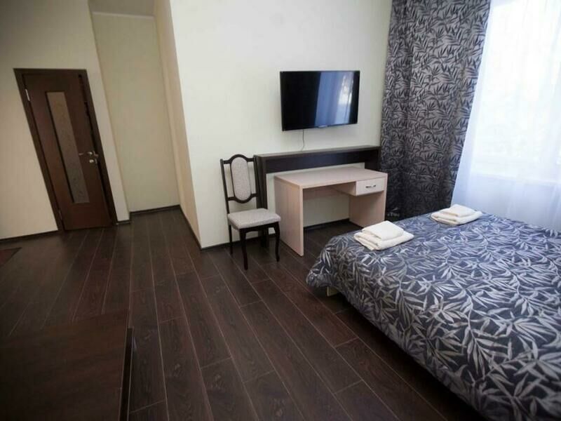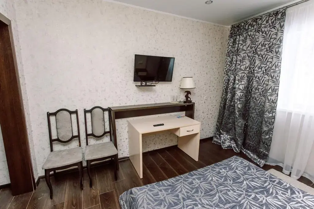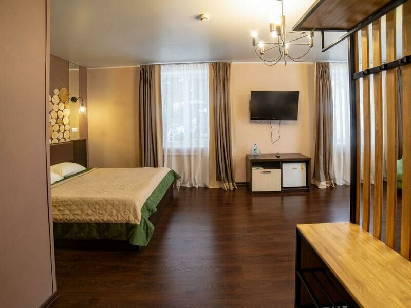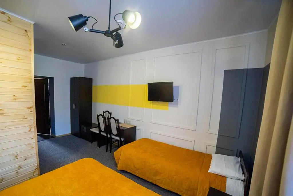 Двухместные номера в гостинице «SkyDream» расположены на втором этаже здания. Оснащены двуспальными кроватями, прикроватными тумбами, двумя креслами, столом, стульями, телевизором, диваном, прихожей.