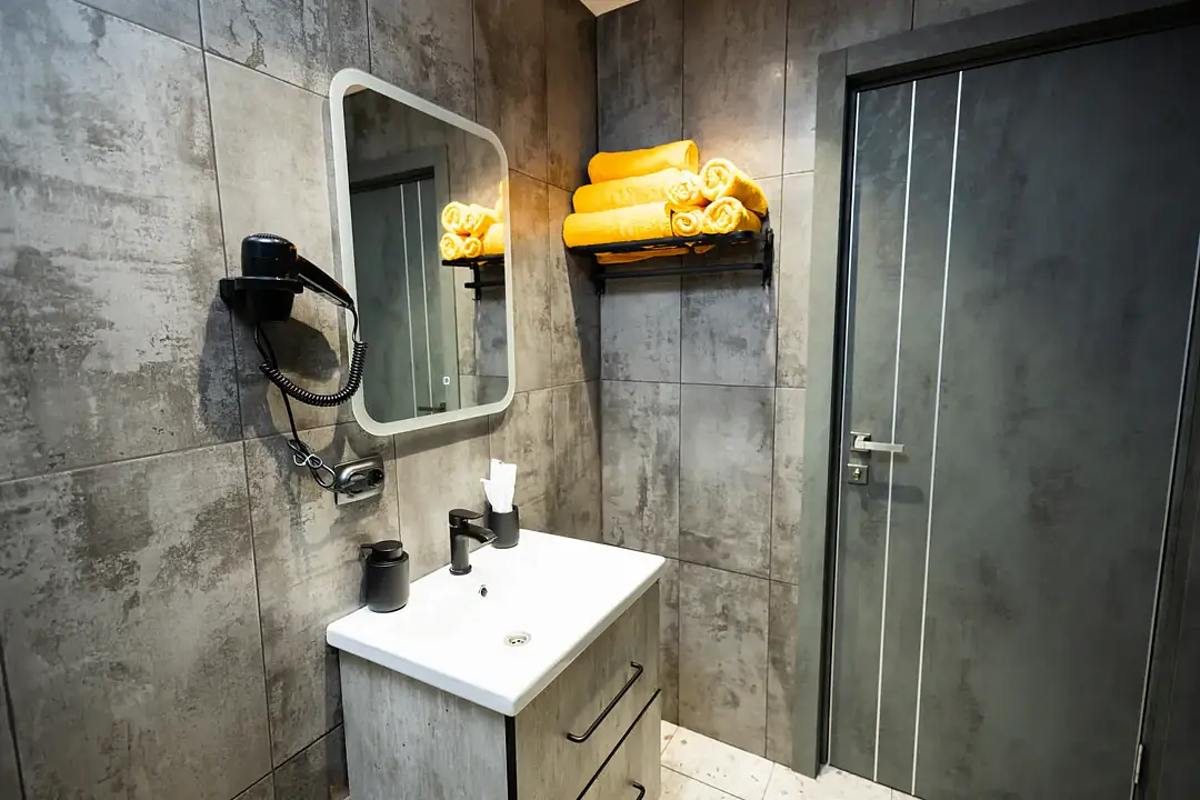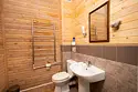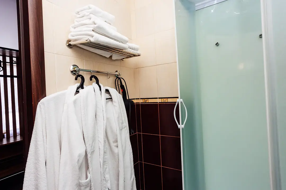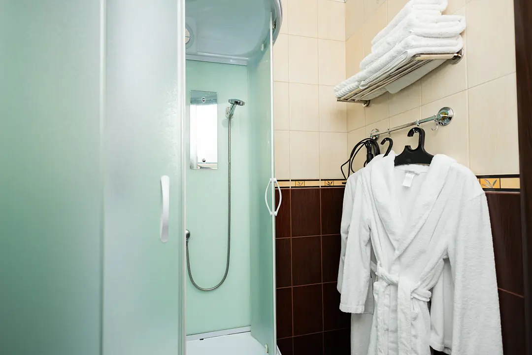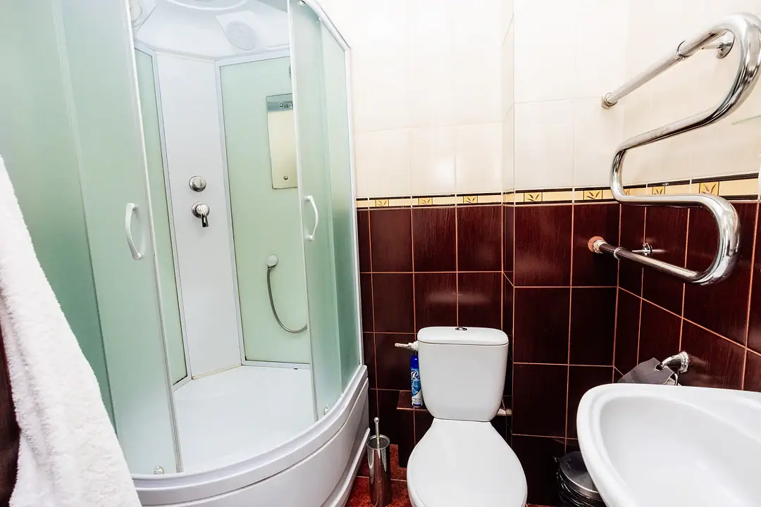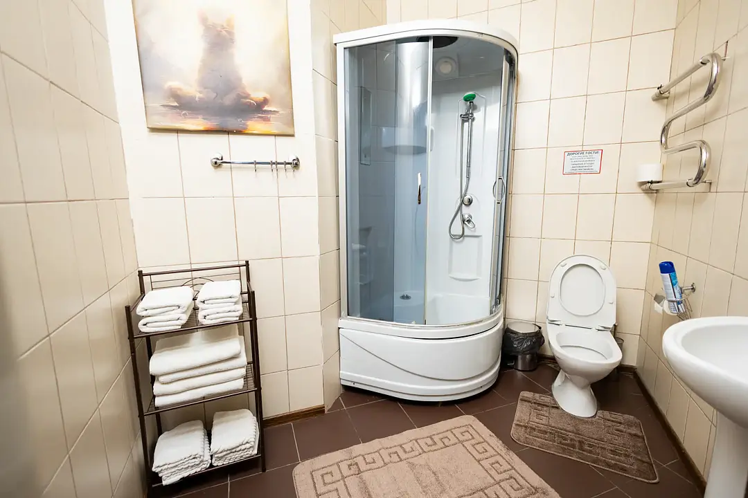 В ванной комнате — душевая кабина, санузел, комплект полотенец, гостиничная парфюмерия (мыло, шампунь, паста, зубная щетка, гель для душа)