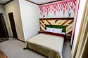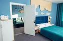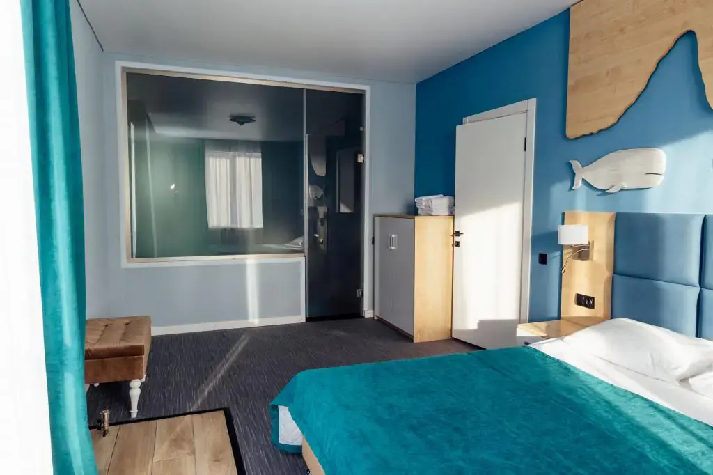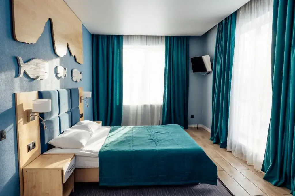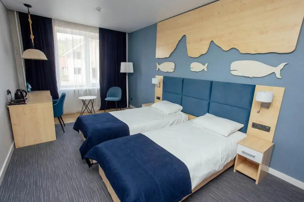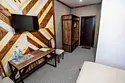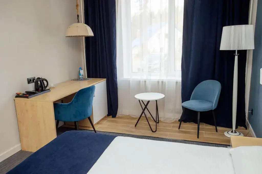 Двухместные номера в гостинице «SkyDream» расположены на втором этаже здания. Оснащены двуспальными кроватями, прикроватными тумбами, двумя креслами, столом, стульями, телевизором, прихожей.