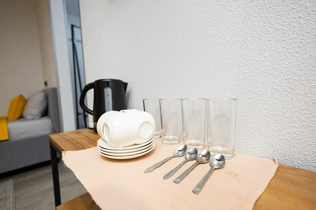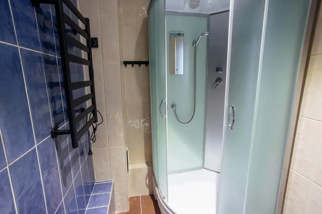 В номере прикроватная тумба, стол, стулья, мини-холодильник, чайник, мини-диван, санузел с душем, комплект полотенец.