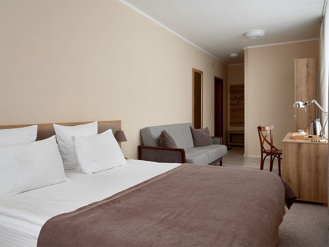 Комфортный двухместный номер Джуниор Сюит, с возможностью размещения одного или двух человек. Площадь комнаты не менее 25 кв.м. За проживание детей в возрасте до 7-и лет без предоставления отдельного места, оплата не взимается.Услуги и удобства