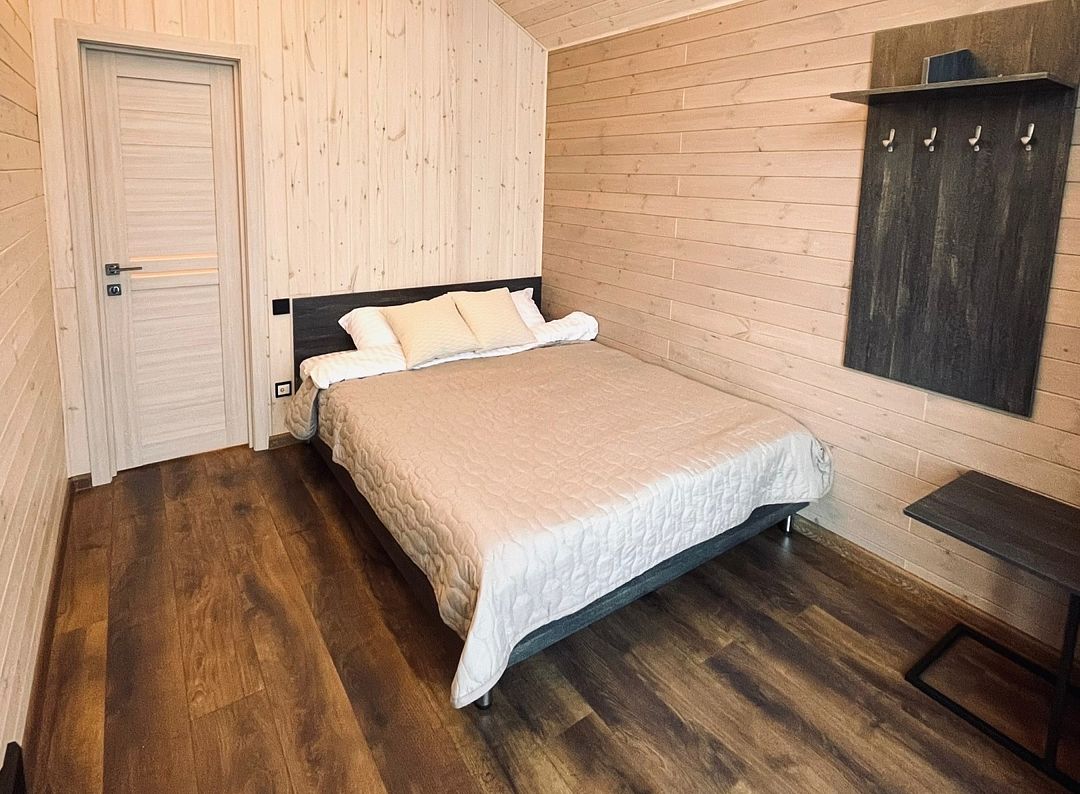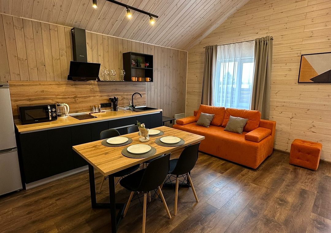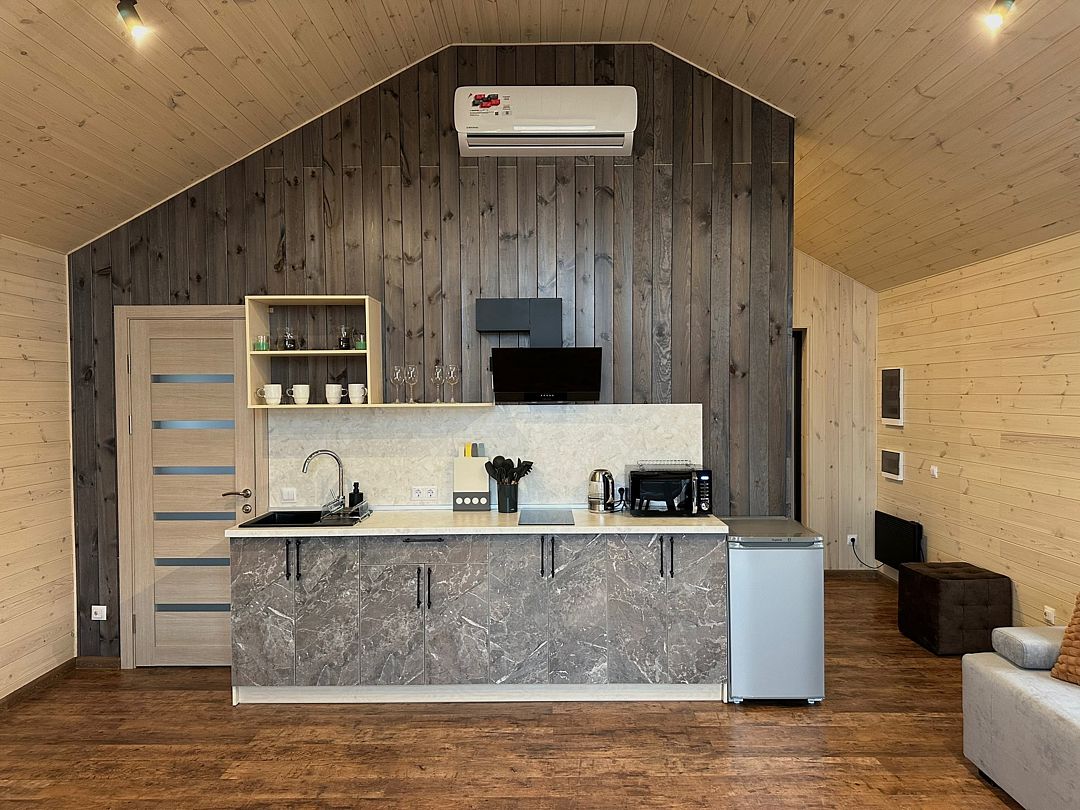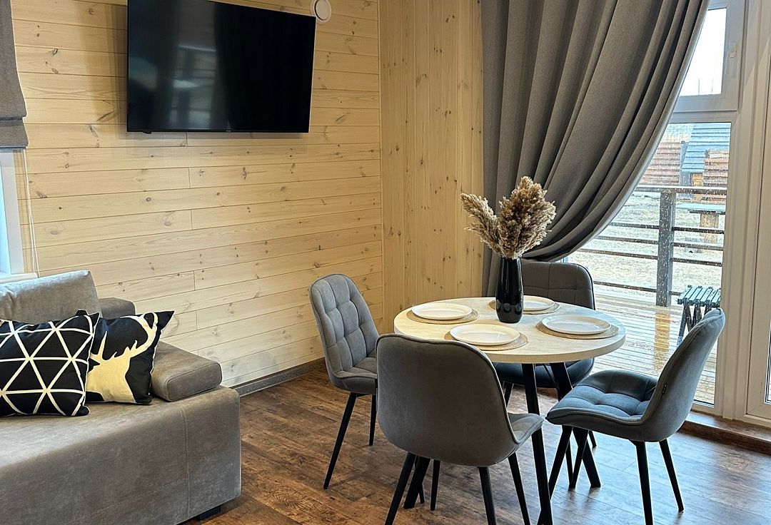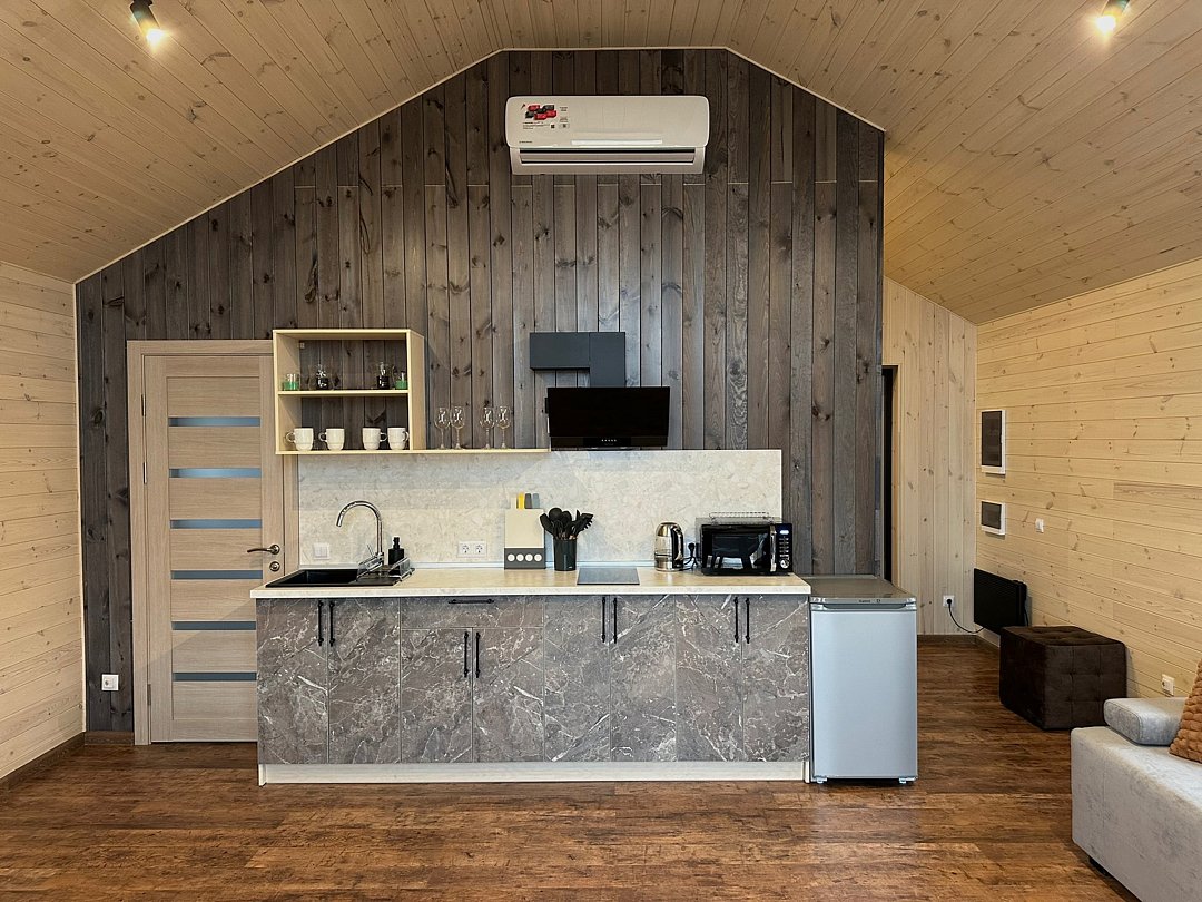 Домики рассчитаны на размещение 2–6 человек. Везде теплые полы, гостиная, совмещенная с кухней, персональный санузел с душевой, перед каждым домиком – терраса с креслами и обустроенная зона барбекю. Все дома укомплектованы бытовой техникой: есть холодильник, микроволновка, варочная панель, чайник, фен, телевизор.