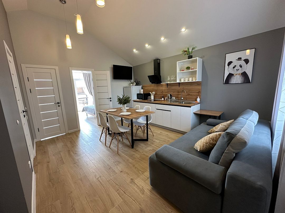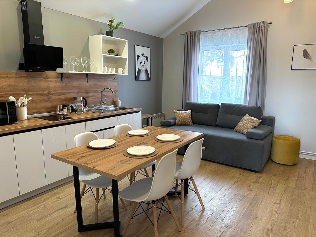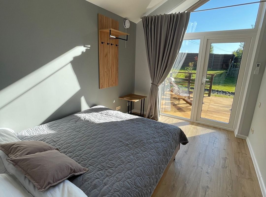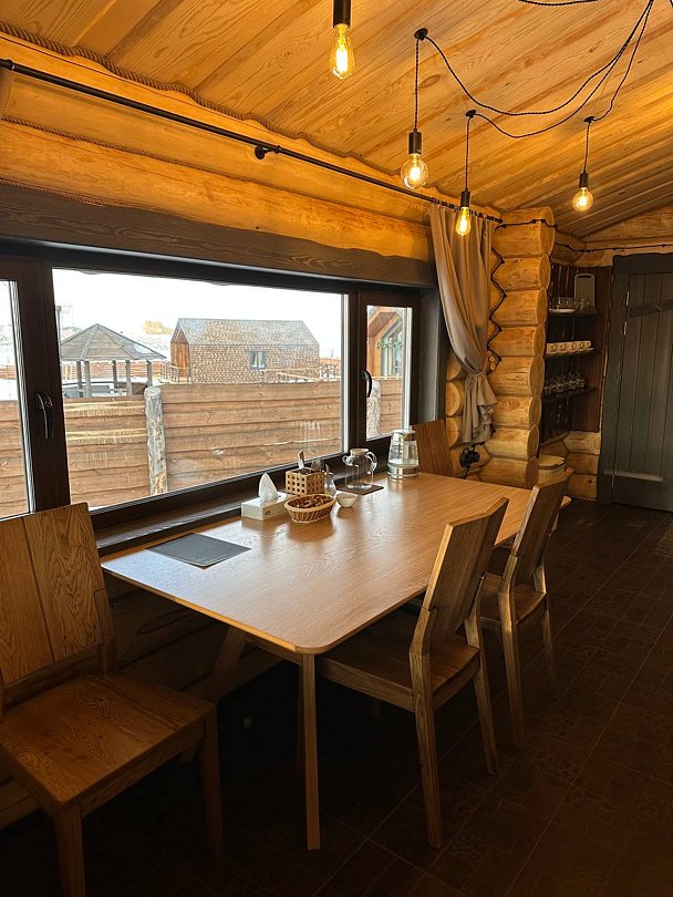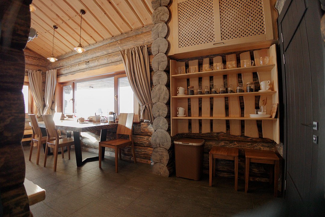 Домики рассчитаны на размещение 2–6 человек. Везде теплые полы, гостиная, совмещенная с кухней, персональный санузел с душевой, перед каждым домиком – терраса с креслами и обустроенная зона барбекю. Все дома укомплектованы бытовой техникой: есть холодильник, микроволновка, варочная панель, чайник, фен, телевизор.