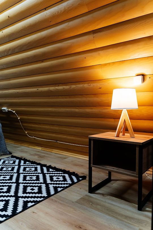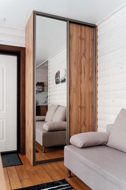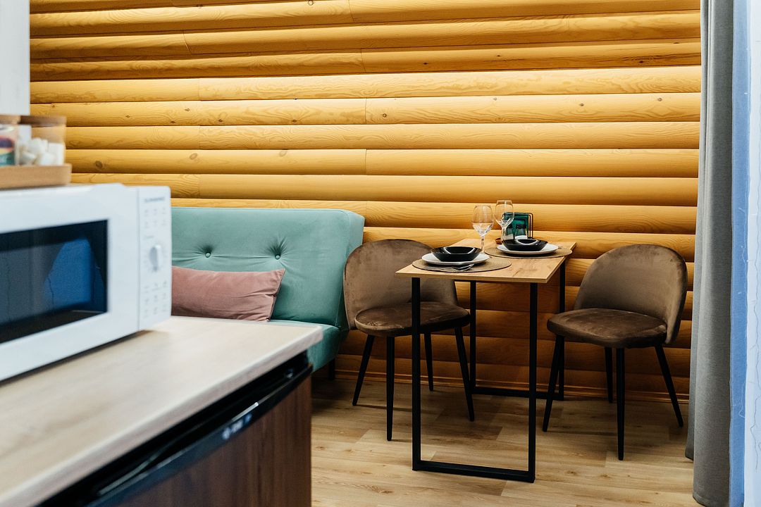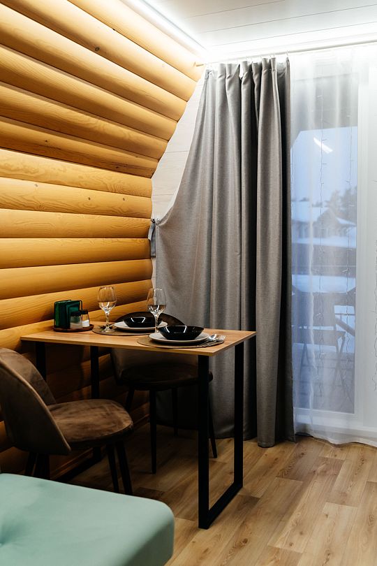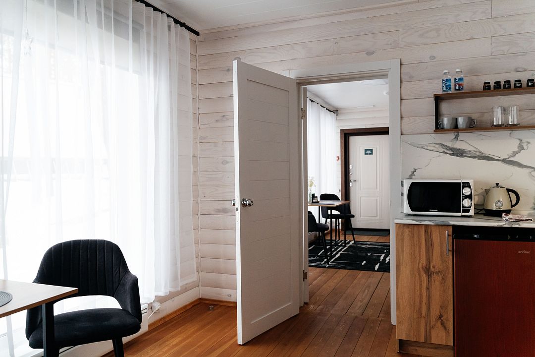 Дом, состоящий из двух половин, соединенных смежной дверью. Каждая половина дома — это гостиная с мини-кухней, спальня и ванная комната.
