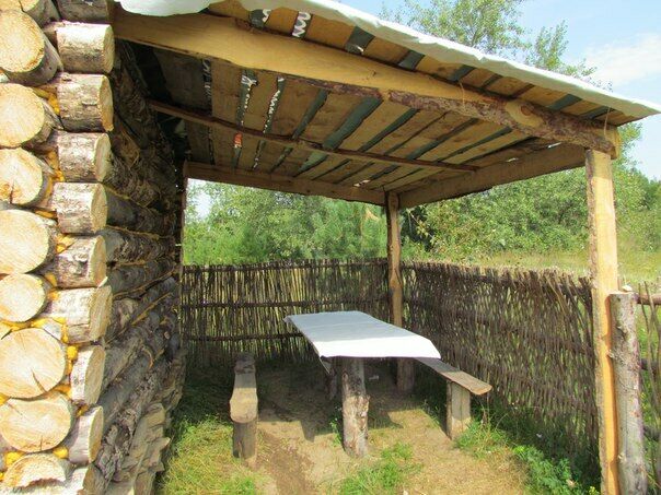 На улице: под навесом, стол с лавками, свет электрический проведен под навес.