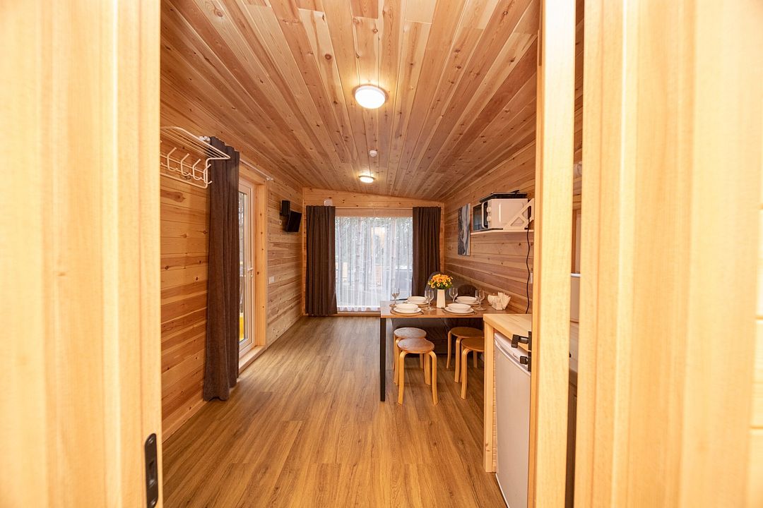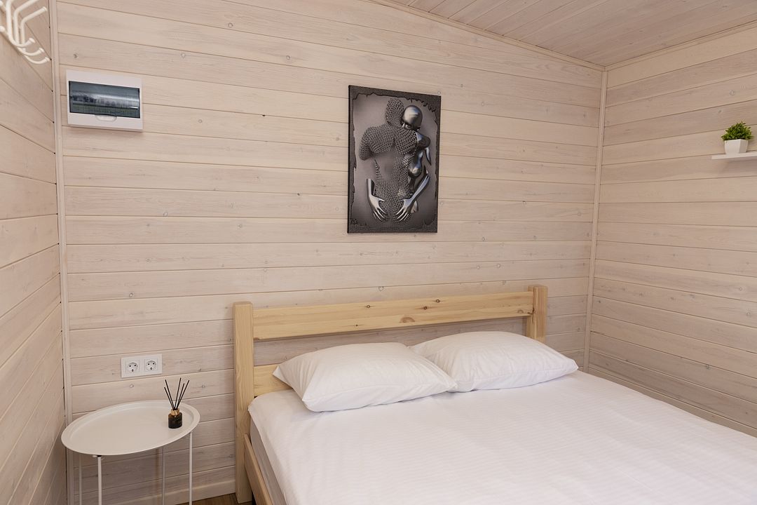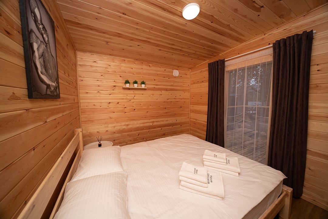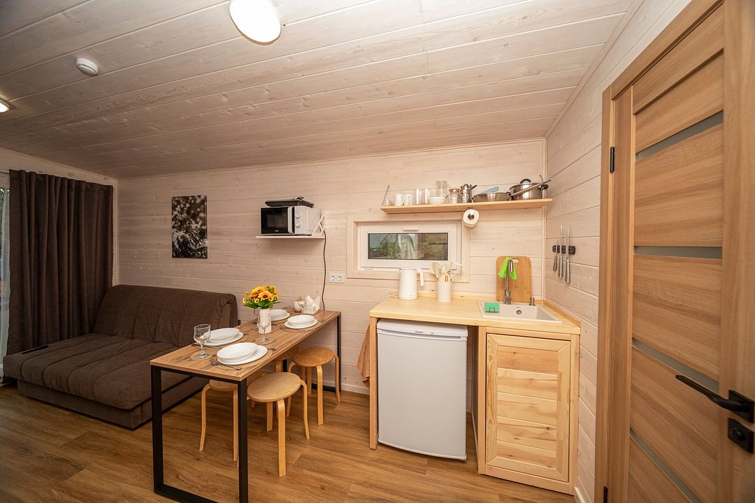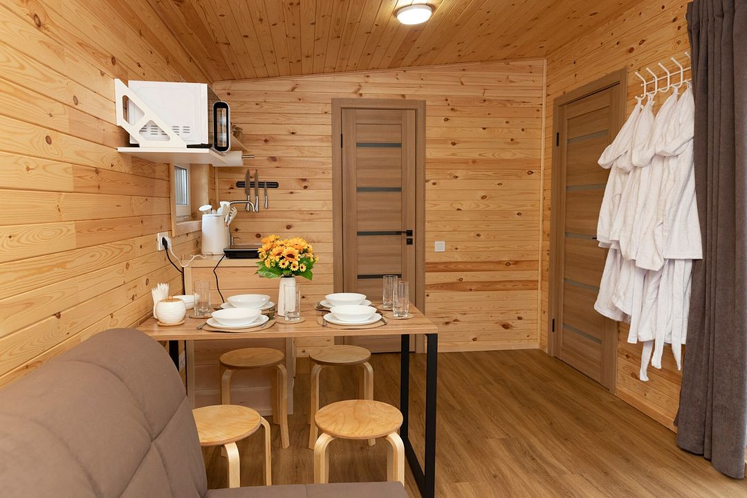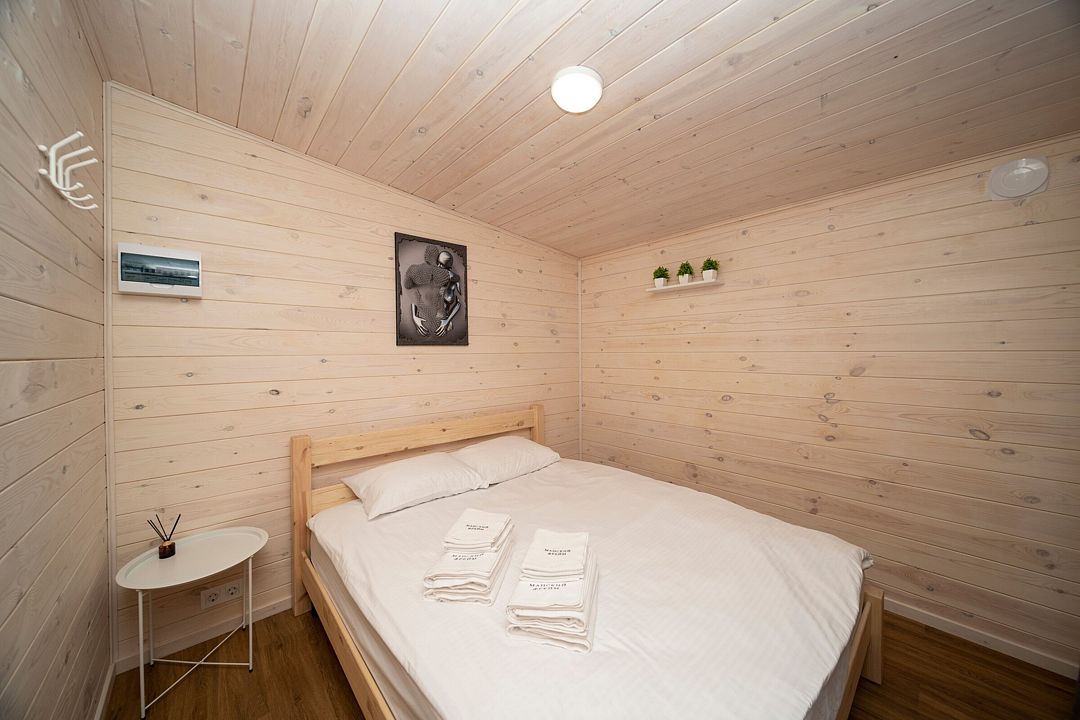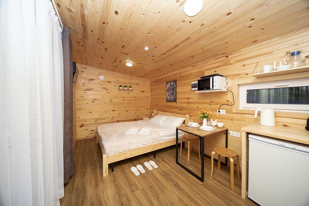 В распоряжении гостей домики для 2–4 человек с базовыми удобствами: санузел, кухня, двуспальная кровать. Идеальны для короткого отдыха в уютной атмосфере. Для удобства работает интернет Wi-Fi.
