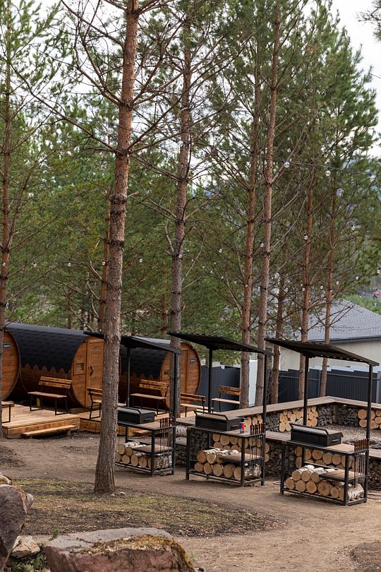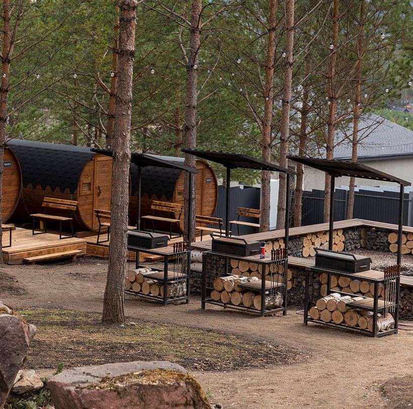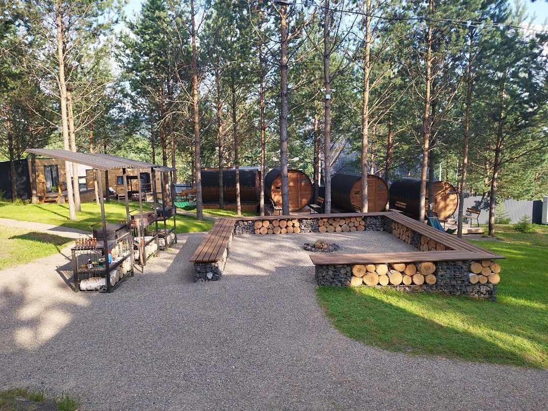 На территории предусмотрено небольшое кострище с деревянными скамейками это место, где можно собраться с друзьями, погреться у огня и поговорить под открытым небом. Пространство с мангалами, где можно самостоятельно приготовить шашлык, плов или что-то по настроению. Так же на территории есть баня-бочка на 4 персоны, где легко прогреться и сбросить усталость.