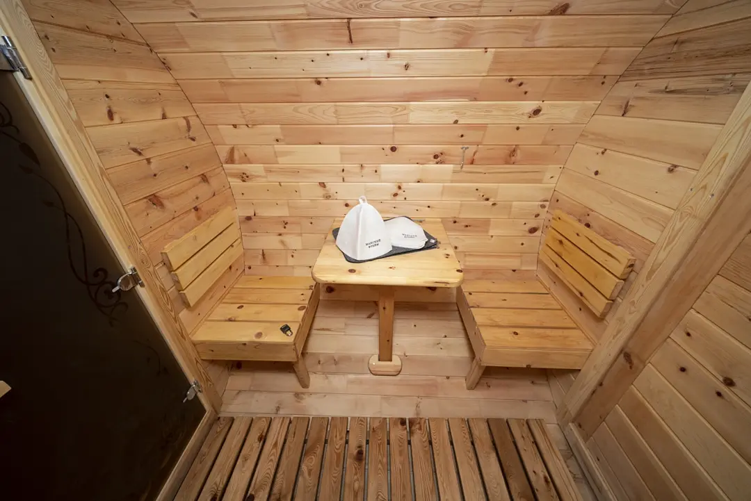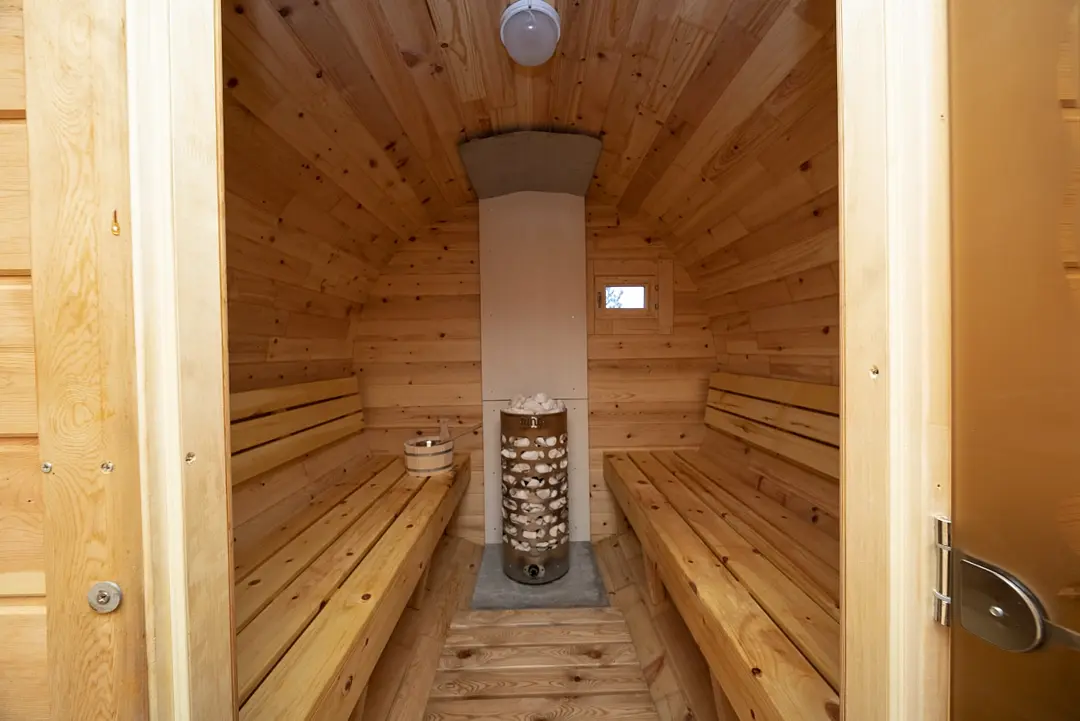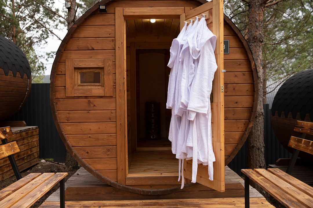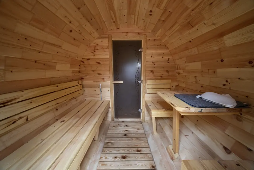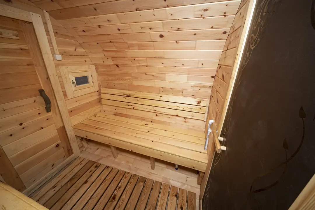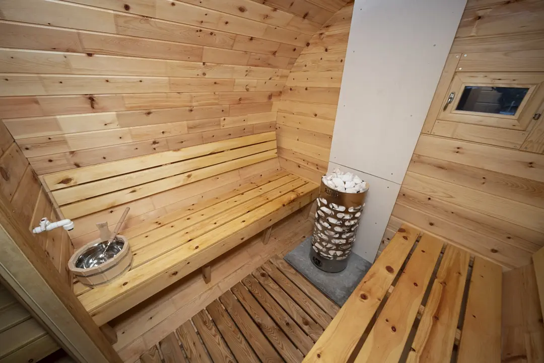 Баня-бочка на 4 персоны. Электрокаменка, деревянный интерьер и холодная вода рядом — всё по классике. Легко прогреться и сбросить усталость.