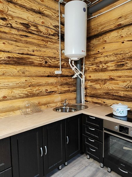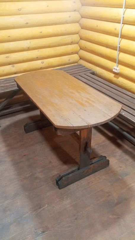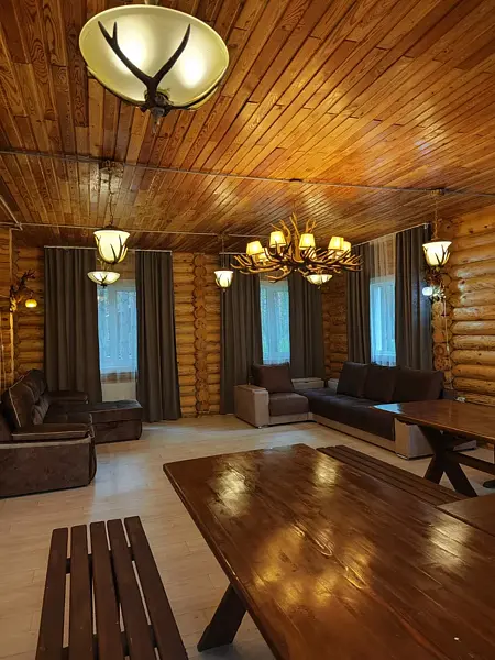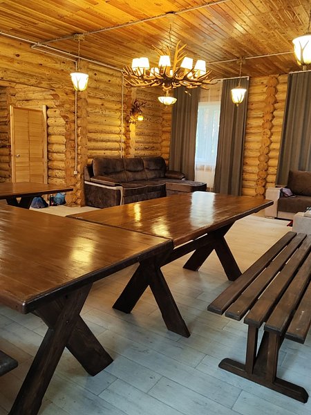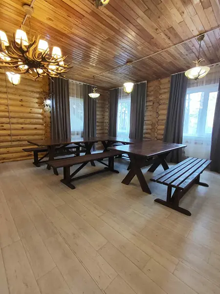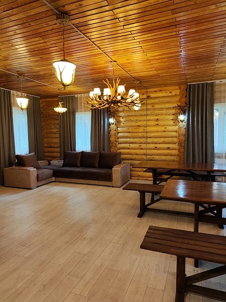 Зал оснащен столами и лавками. Также имеется два угловых дивана. Также предоставляется кухня для приготовления пищи с варочной поверхностью и духовкой.