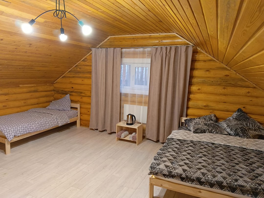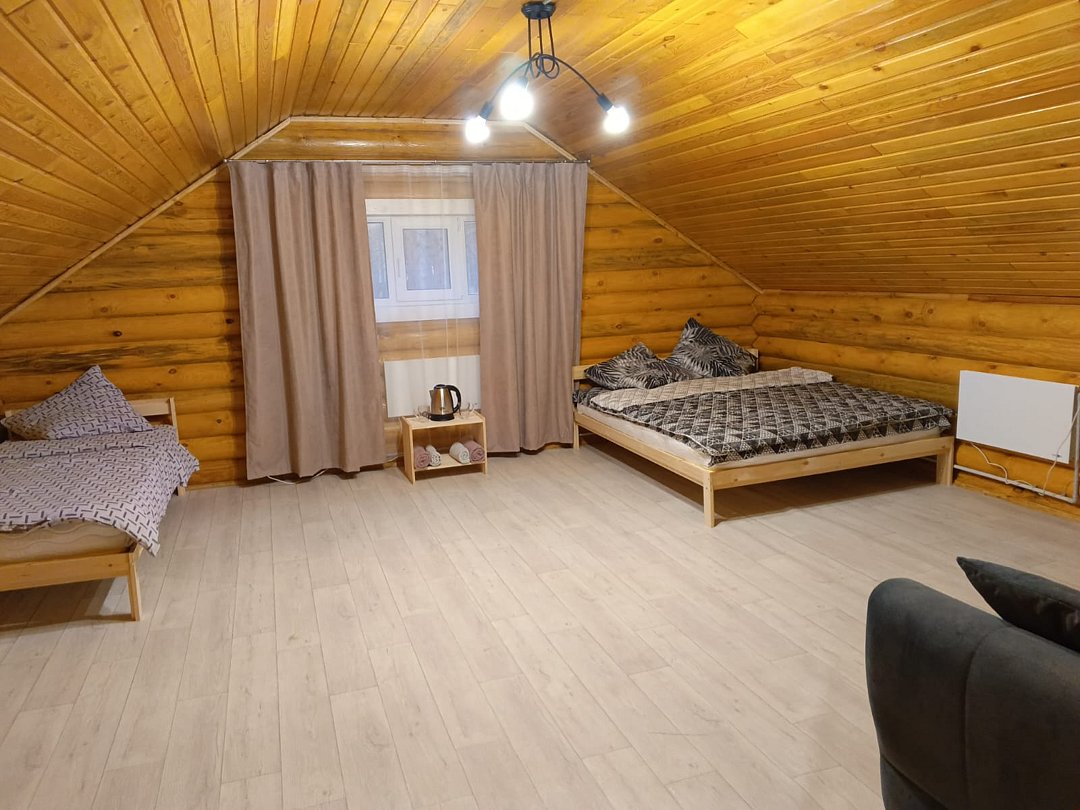 Номер находится на втором этаже двухэтажного дома, в номере кровать на 160х200, комфортный раскладной диван и кровать 90х200. Тумба, чайник, посуда, столовые приборы.