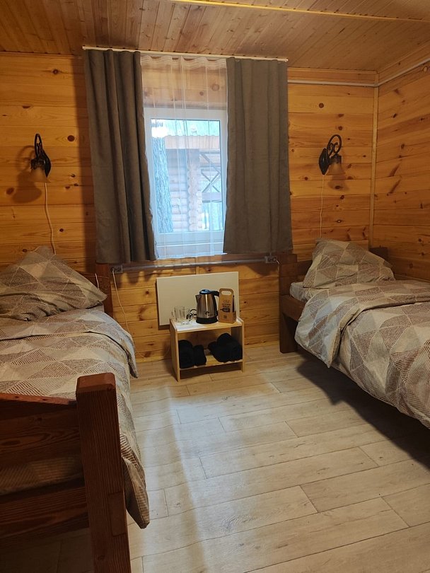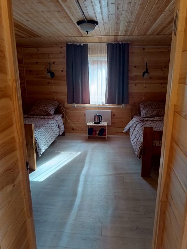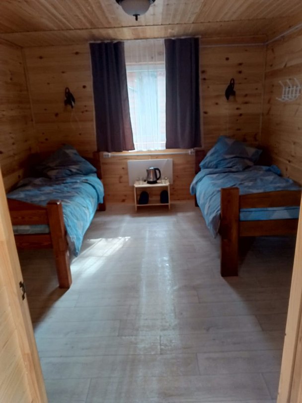 Двухместный номер с двумя раздельными кроватями 90х200. В доме 4 номера. Оснащение: чайник, вешалка, чайная пара, столовые приборы.