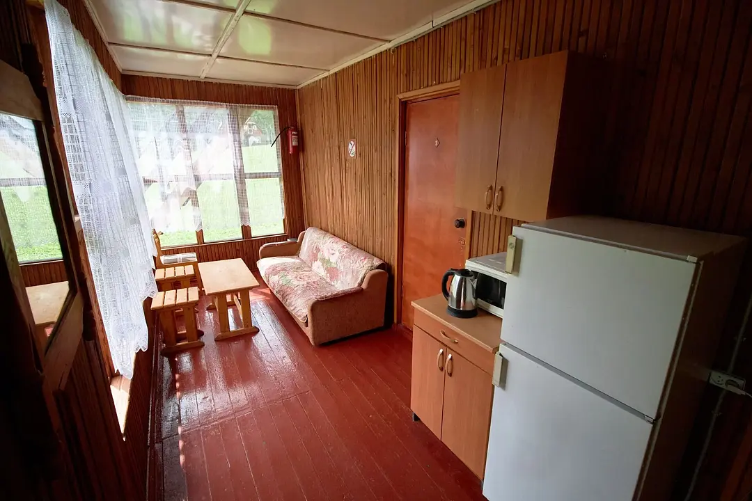 Деревянный домик с холодильником, чайником и микроволновой печью. Рядом с каждым домиком — беседка с мангалом. За домиком расположен летний туалет.