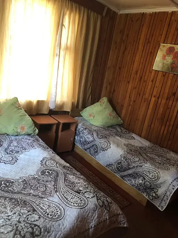 Две раздельные спальни, в одной – двухспальная кровать, в другой – две односпальных, просторная кухня-гостиная, санузел, беседка.
