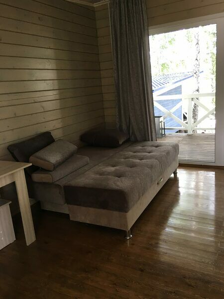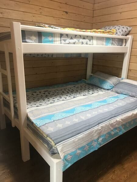 Дом рассчитан на семью, небольшую компанию. Две спальни изолированы холлом. В каждой комнате большая двухъярусная кровать: нижний ярус двуспальный, верхний односпальный. Большой холл с кухней. Отдельная зона для пикника.