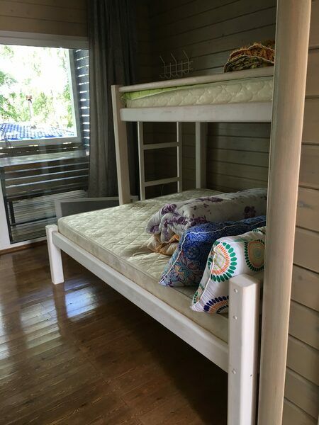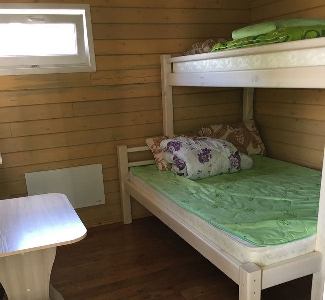 Домик состоит из пяти отдельных комнат, каждая с отдельным выходом на веранду. В каждой комнате двухъярусная кровать: нижний ярус двуспальный, верхний односпальный.