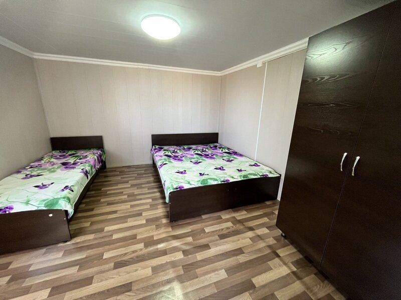 В комнате: одна двуспальная и две односпальные кровати, шкаф, постельное бельё.