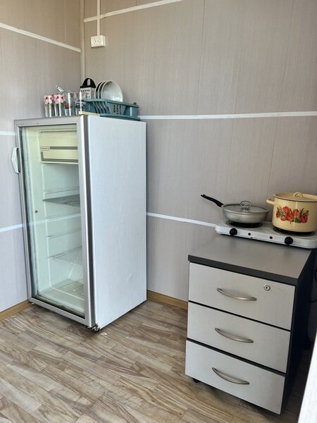 В кухне: вся необходимая посуда, чайник, холодильник и плита.