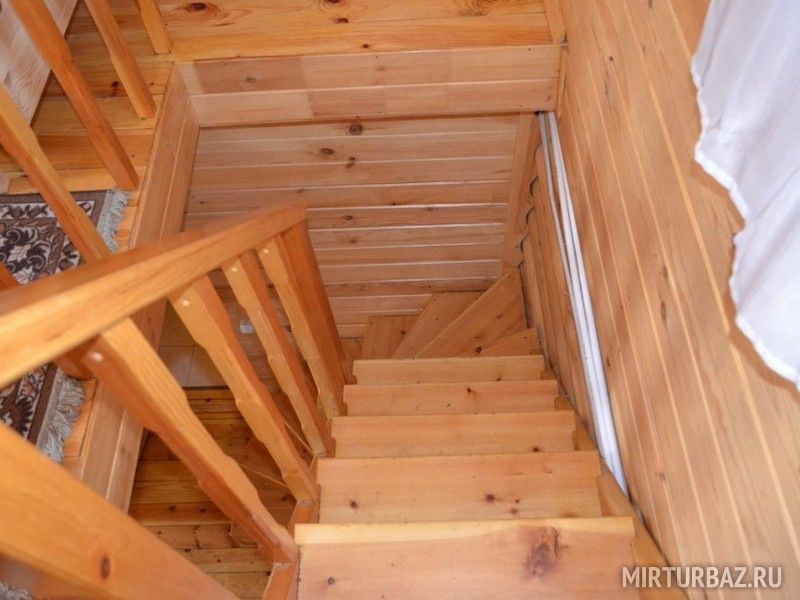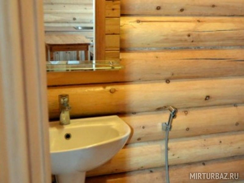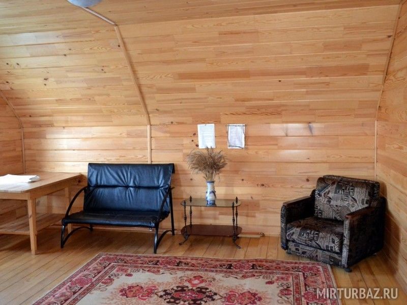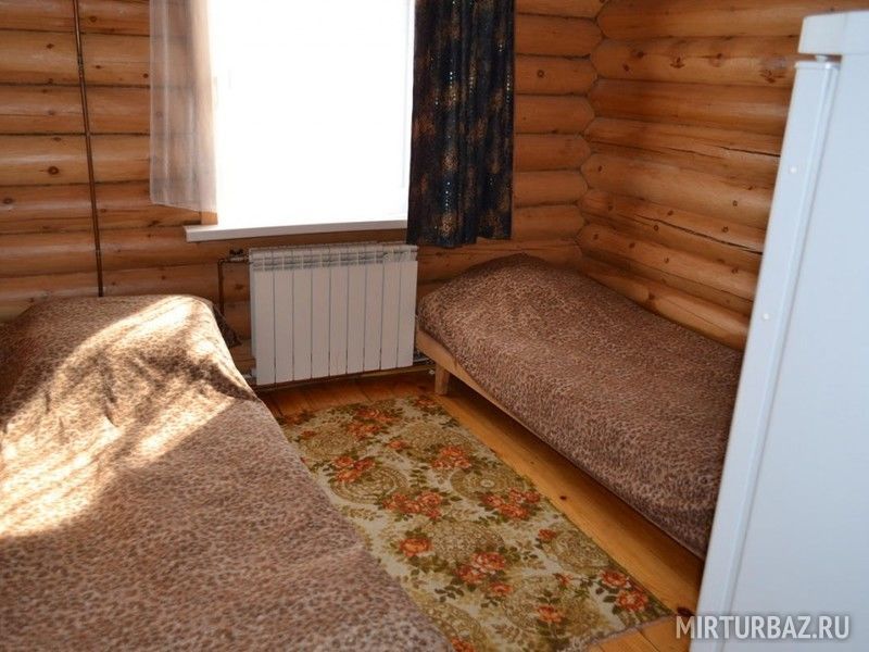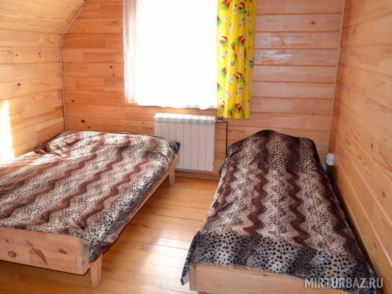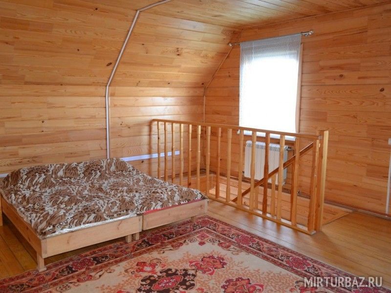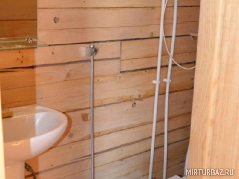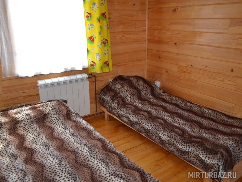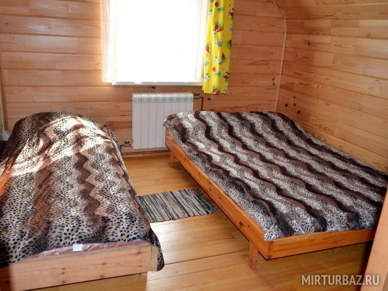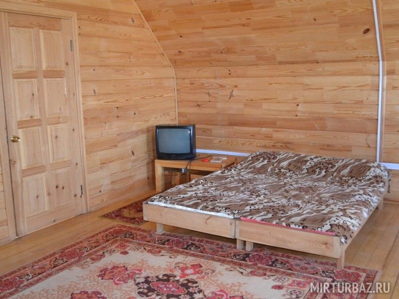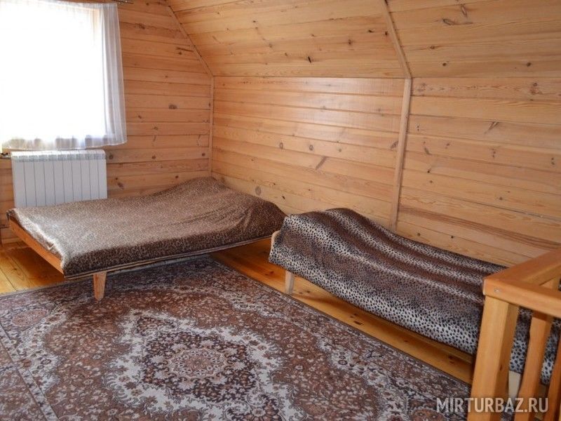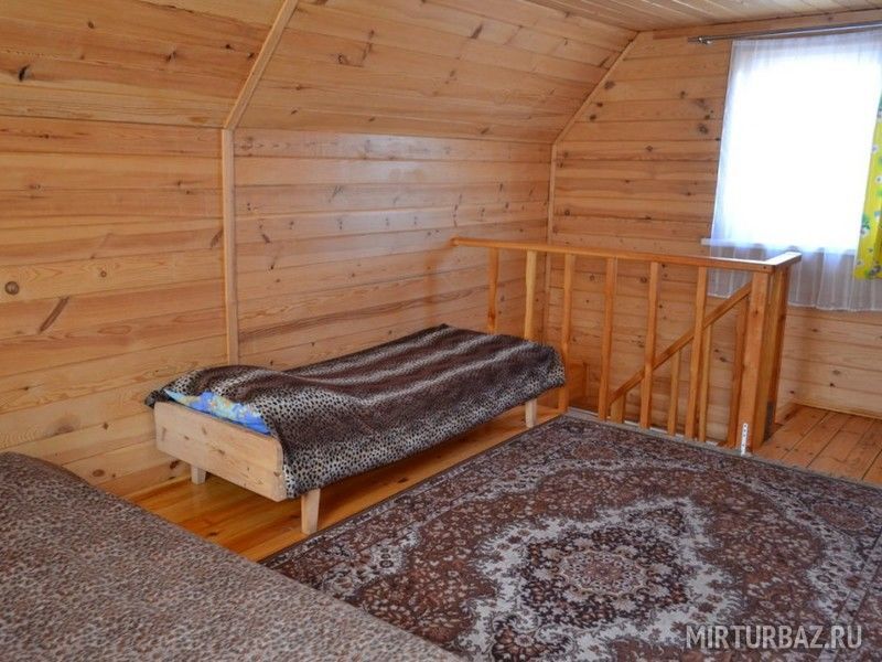 Дом двухэтажный, на первом этаже кухонная зона, электрочайник, мойка, посуда на 7 человек. Две жилые комнаты с односпальными кроватями. На втором этаже жилая комната с двуспальной и односпальной кроватями. Удобства на дом: Туалет, раковина, гигиенический душ.