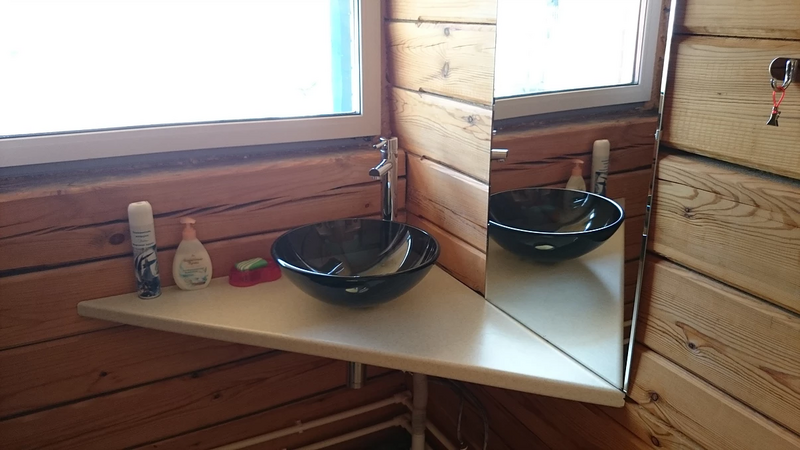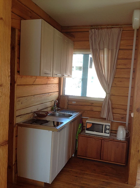 Отдельный сан.узел с душевой кабиной, кухонная зона с посудой, холодильником и микроволновкой.