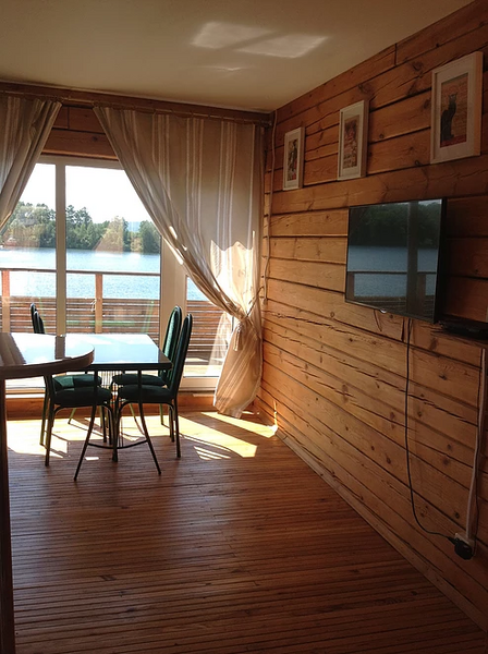 Есть общий зал с кухонной зоной и камином. В гостиной вы сможете самостоятельно приготовить себе обед, отдохнуть, посмотреть телевизор. Гостиная оборудована бытовой техникой, посудой, телевизором, одним большими холодильниками, столами и стульями, на этаже каминный зал с выходом на просторную террасу с видом на озеро.
