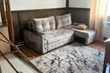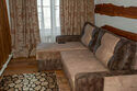 В гостиной - обеденный стол, угловой диван, трансформирующийся в двуспальную кровать, телевизор.