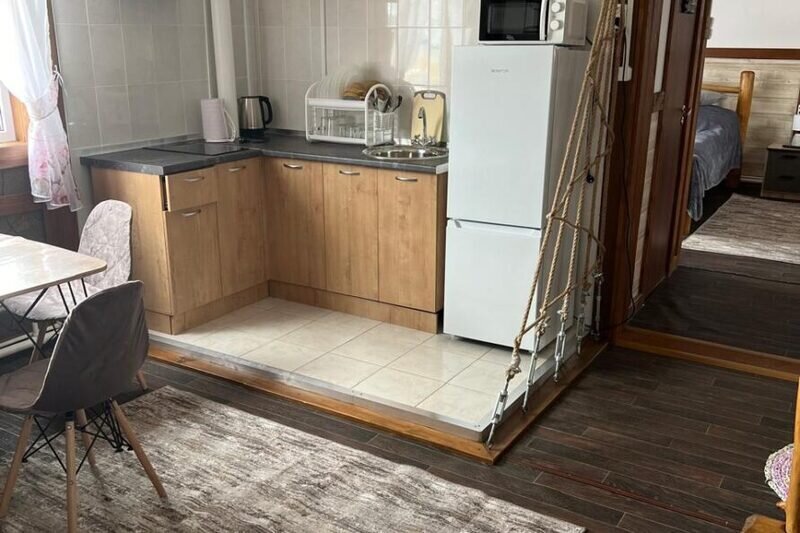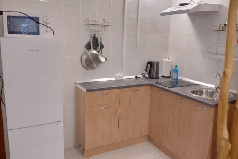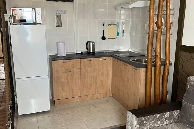 Кухонная зона с холодильником, СВЧ, варочной поверхностью и всей необходимой кухонной утварью и посудой.