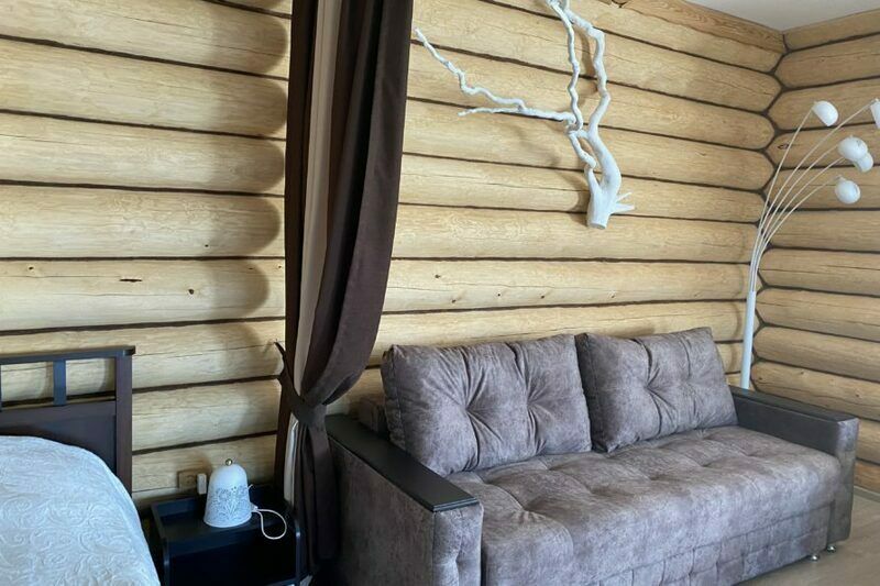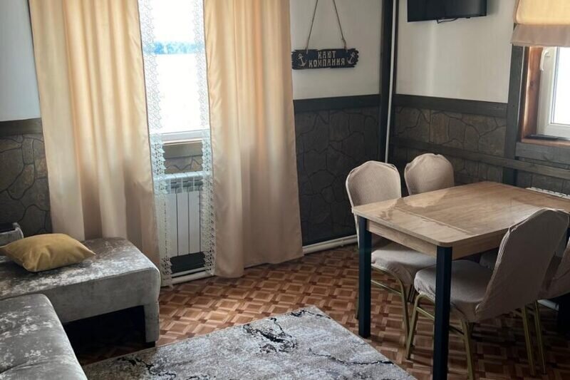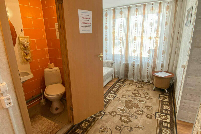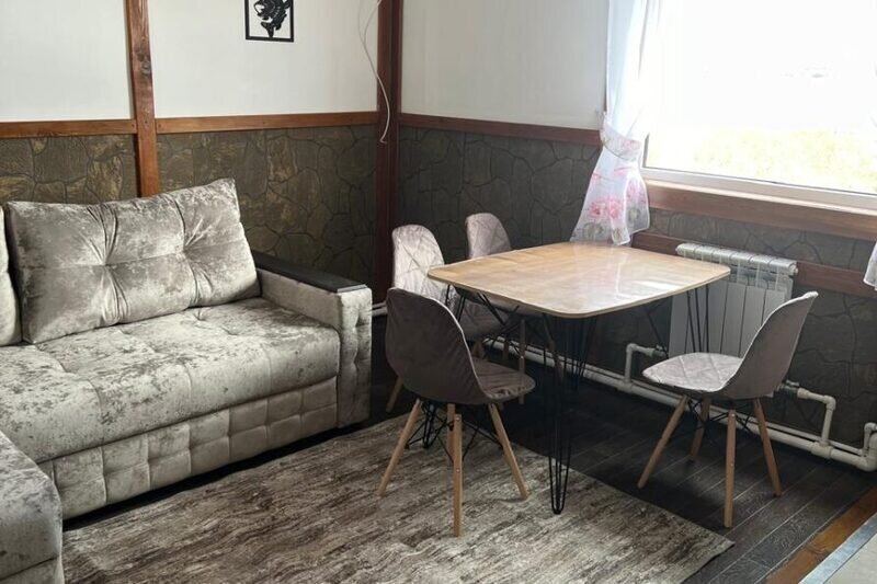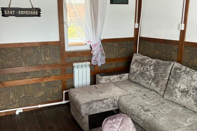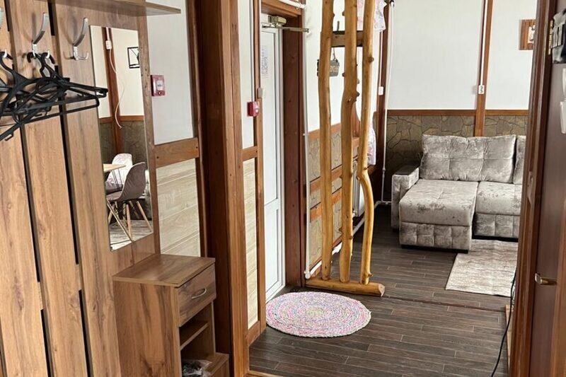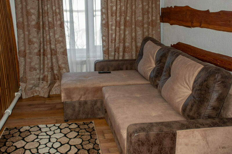 В комнате отдыха – диван, который трансформируется в полноценное спальное место для двоих, чайный столик, пуф, телевизор ( 20 каналов). Душ и туалет совмещены.