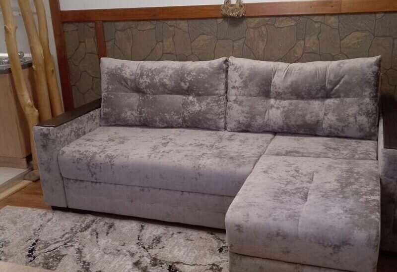 В гостиной: обеденный стол, угловой диван, трансформирующийся в двуспальную кровать, телевизор.