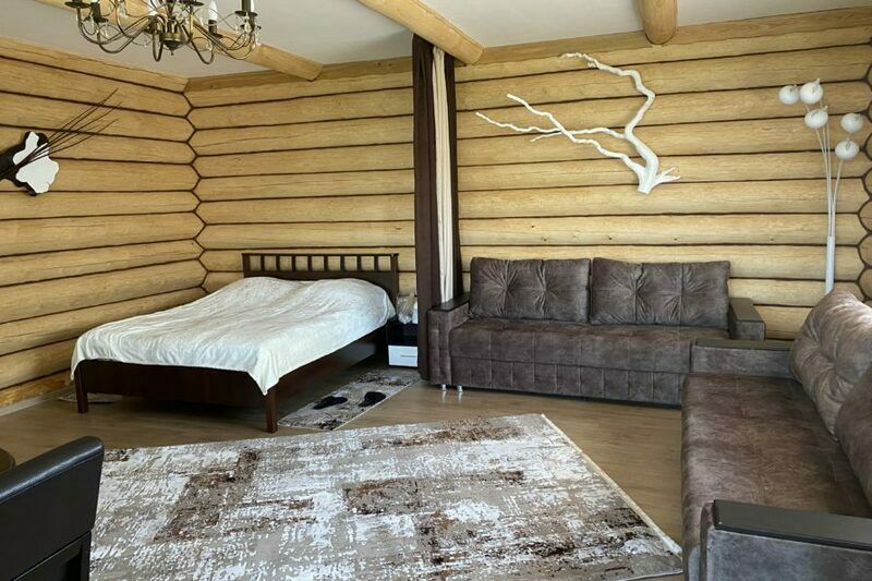 Номер оформлен в стиле охотничьего домика чучелами птиц, шкурами диких животных. На полу самотканые дорожки.