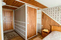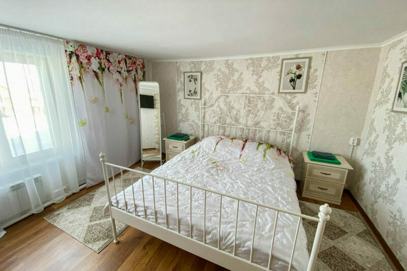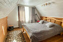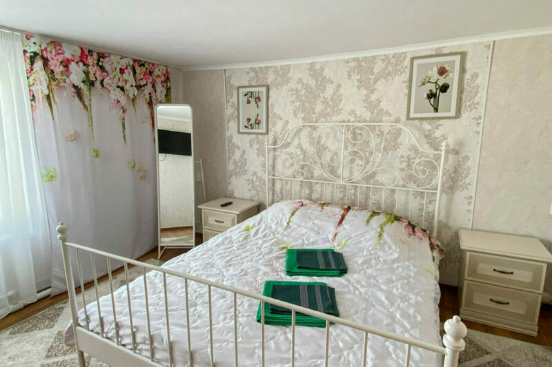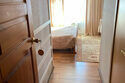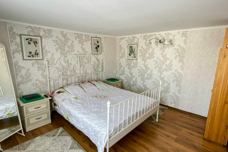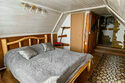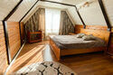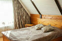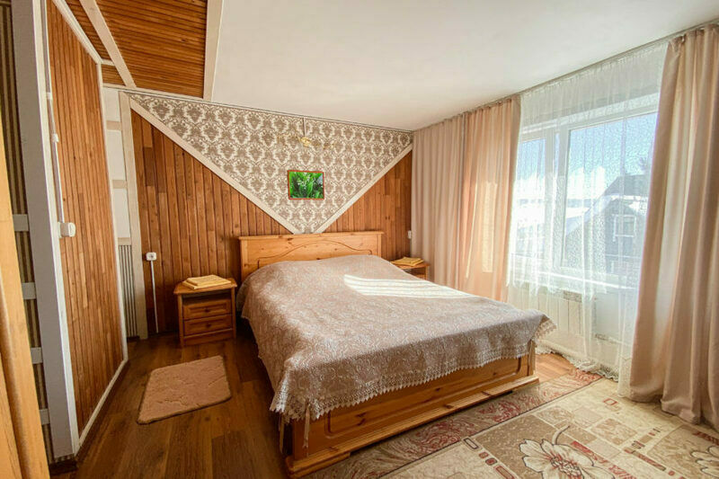 В спальне - большая двуспальная кровать из массива осины, прикроватные тумбочки.